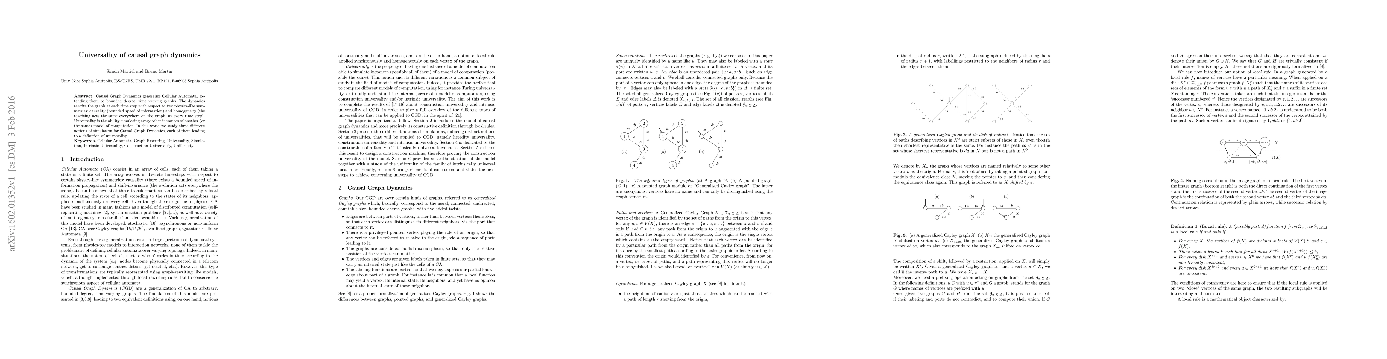 This paper explores Causal Graph Dynamics, a generalization of Cellular Automata that operates on bounded degree, time-varying graphs, emphasizing causality and homogeneity. The study investigates three notions of simulation within this framework, aiming to define and demonstrate the universality of these dynamics.