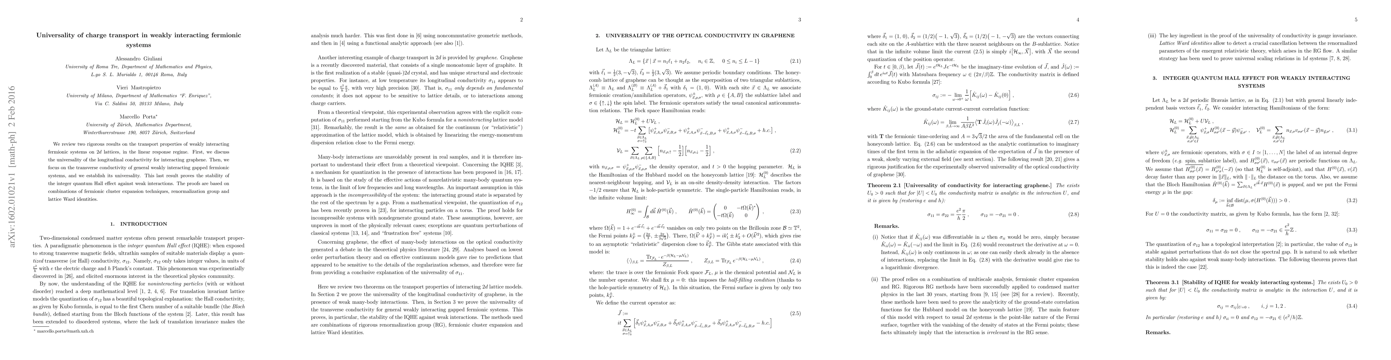 The paper presents a novel combination of fermionic cluster expansions, renormalization group methods, and lattice Ward identities to prove the universality of charge transport in weakly interacting fermionic systems.