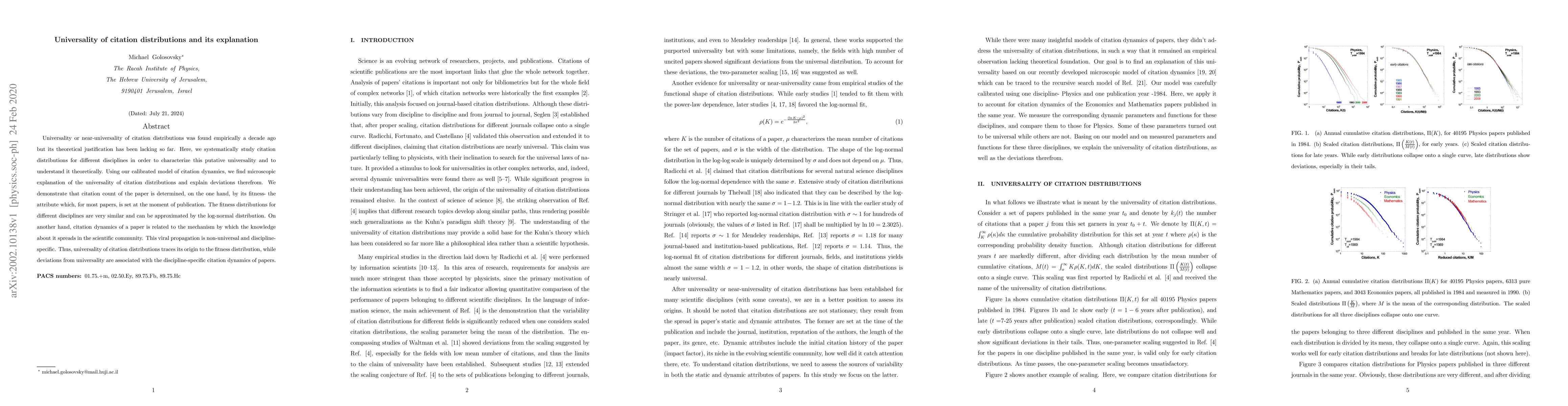 This paper investigates the universality of citation distributions across different disciplines, explaining why they often follow similar patterns. It finds that the similarity arises from the log-normal distribution of paper fitness at publication, while deviations are due to discipline-specific citation dynamics.