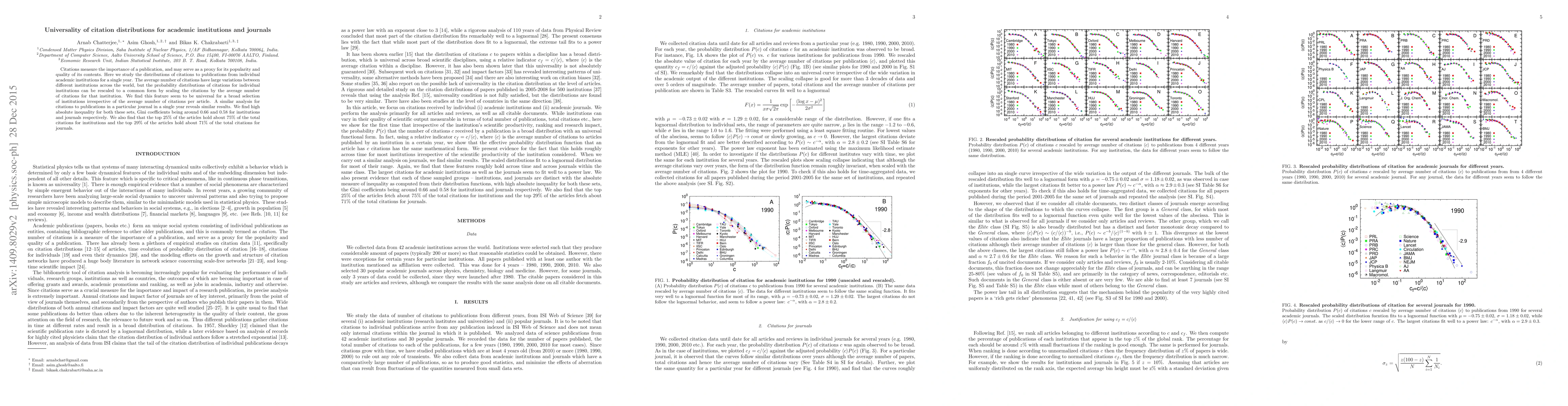 This study reveals that the citation distributions for publications from different academic institutions and journals can be rescaled to a common form, indicating a universal pattern. Despite large variations in average citations, high inequality persists, with top-cited articles capturing the majority of citations.