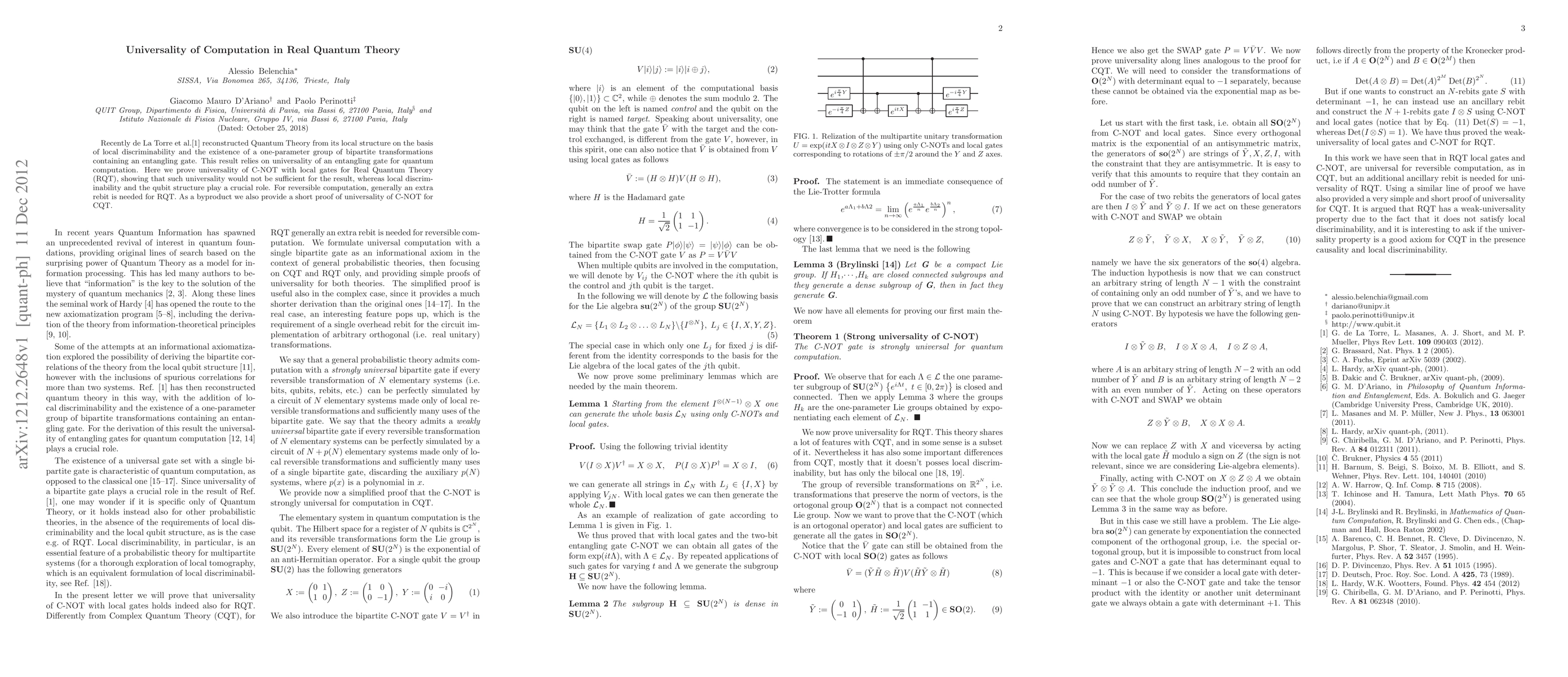 This paper proves the universality of the C-NOT gate with local gates in Real Quantum Theory (RQT), highlighting the importance of local discriminability and qubit structure. It also demonstrates that this universality alone is not sufficient, and provides a proof for the universality of C-NOT in conventional Complex Quantum Theory (CQT).