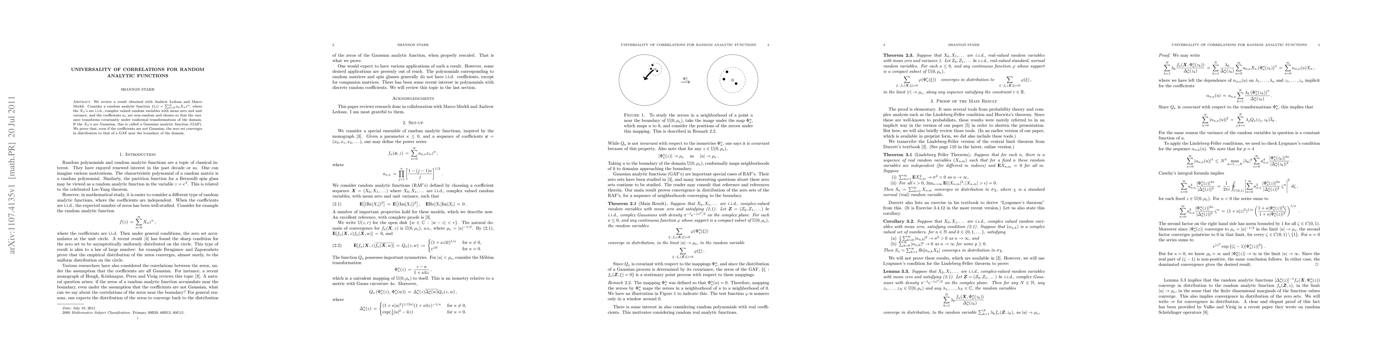 We review a result obtained with Andrew Ledoan and Marco Merkli. Consider a random analytic function $f(z) = \sum_{n=0}^{\infty} a_n X_n z^n$, where the $X_n$'s are i.i.d., complex valued random variables with mean zero and unit variance, and the coefficients $a_n$ are non-random and chosen so that the variance transforms covariantly under conformal transformations of the domain. If the $X_n$'s are Gaussian, this is called a Gaussian analytic function (GAF). We prove that, even if the coefficients are not Gaussian, the zero set converges in distribution to that of a GAF near the boundary of the domain.