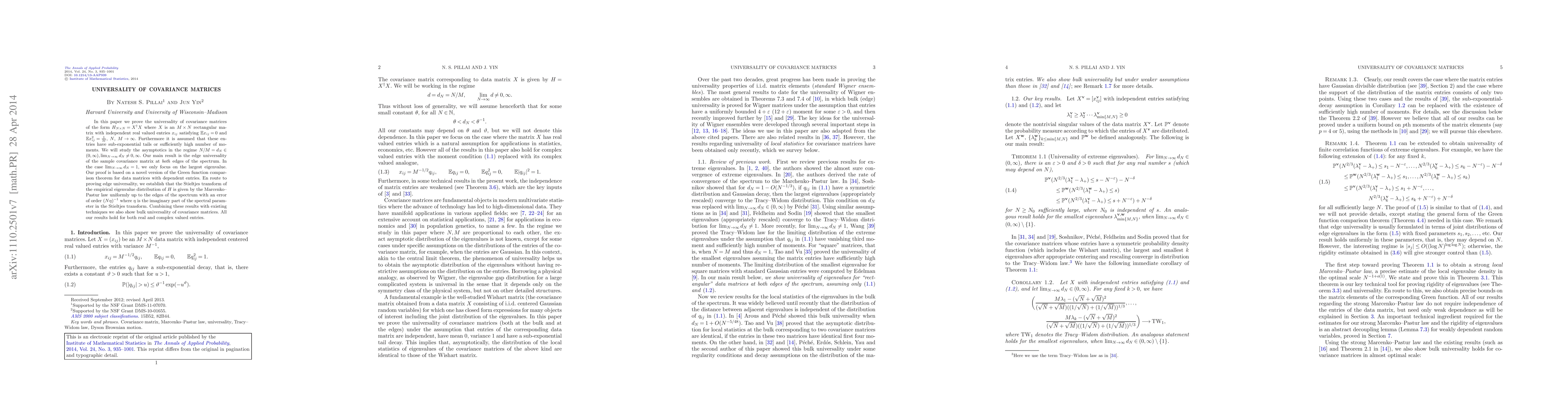 This paper proves the universality of covariance matrices formed by $H_{N\times N}={X}^{\dagger}X$, where $X$ is an $M\times N$ matrix with independent entries. The authors establish edge and bulk universality for the sample covariance matrix, showing that its empirical eigenvalue distribution follows the Marcenko-Pastur law, with results extending to both real and complex entries.