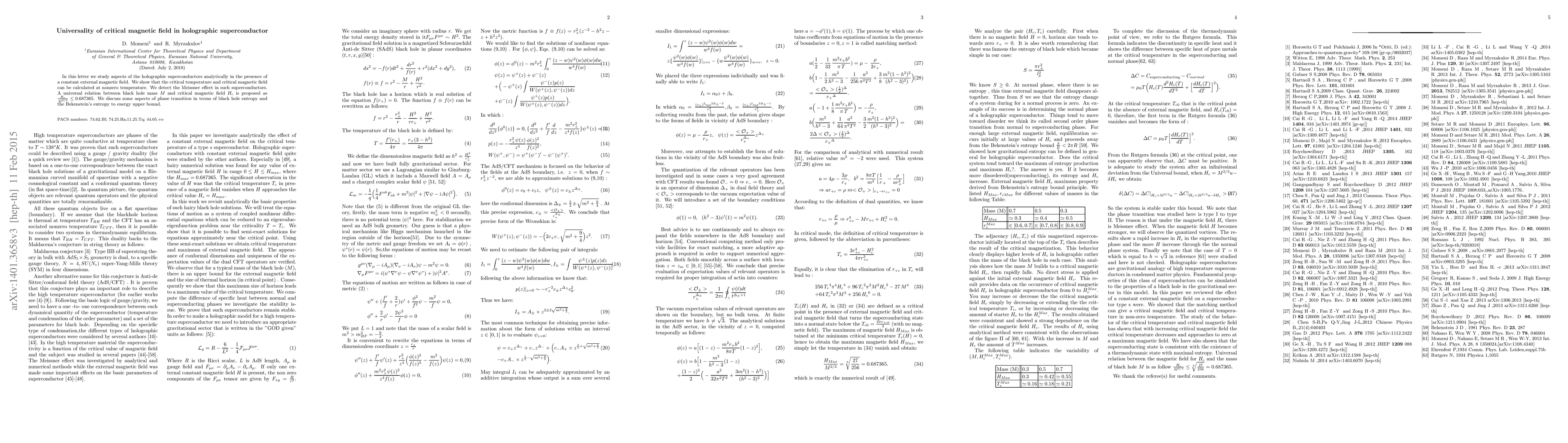 In this letter we study aspects of the holographic superconductors analytically in the presence of a constant external magnetic field. We show that the critical temperature and critical magnetic field can be calculated at nonzero temperature. We detect the Meissner effect in such superconductors. A universal relation between black hole mass $ M$ and critical magnetic field $H_c$ is proposed as $\frac{H_c}{M^{2/3}}\leq 0.687365$. We discuss some aspects of phase transition in terms of black hole entropy and the Bekenstein's entropy to energy upper bound.
