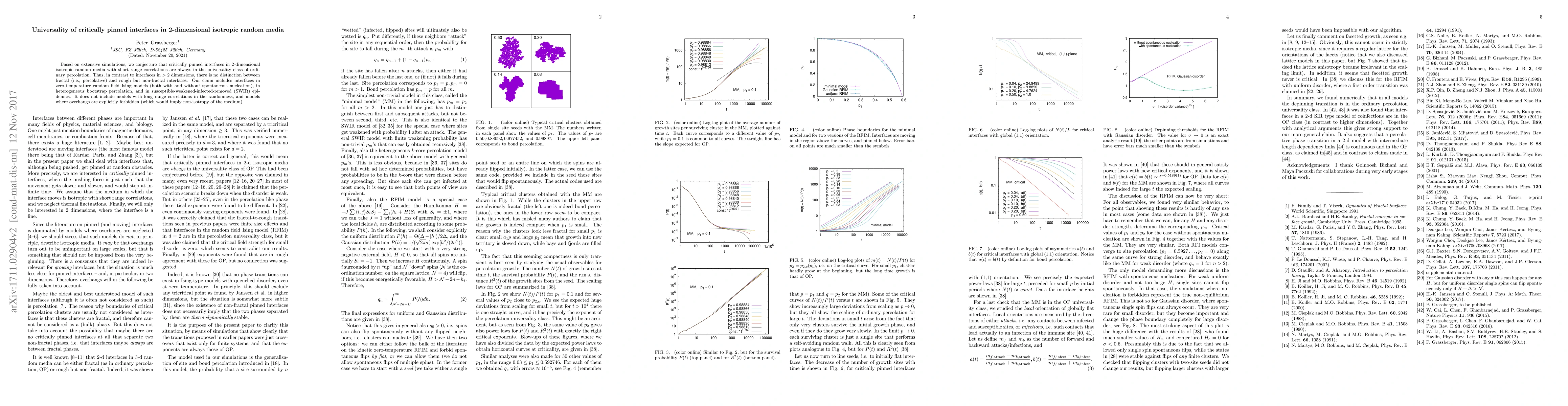This paper proposes that critically pinned interfaces in 2D isotropic random media with short-range correlations exhibit universality, classifying them within the ordinary percolation framework, and excludes long-range correlations or non-isotropic media. The findings apply to various models including Ising, bootstrap percolation, and SWIR epidemics.