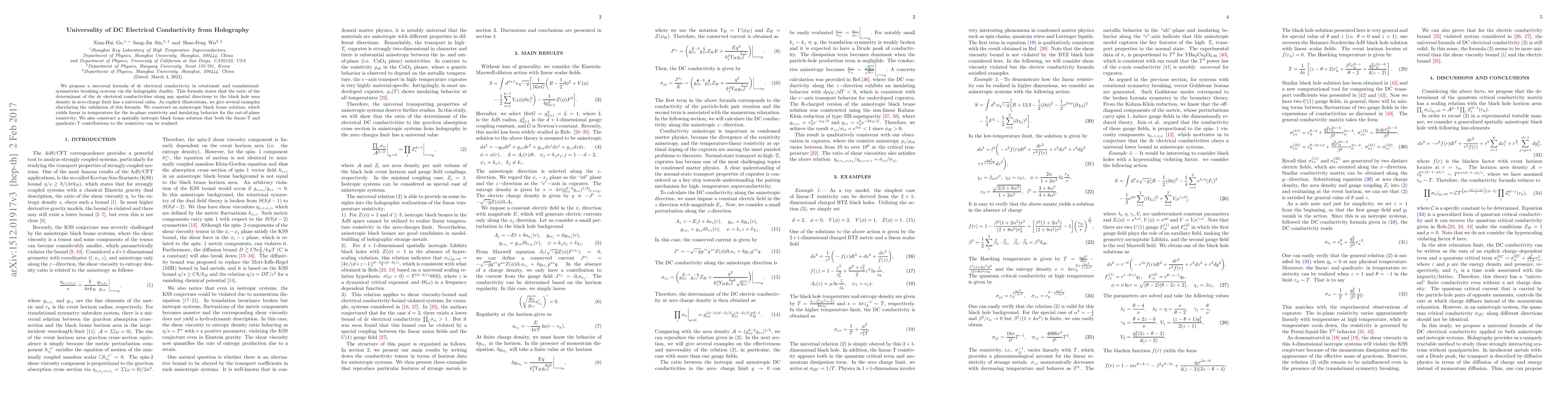 The paper introduces a universal relation between the determinant of dc electrical conductivities and black hole area density, providing insights into holographic realizations of linear temperature-dependent resistivity.