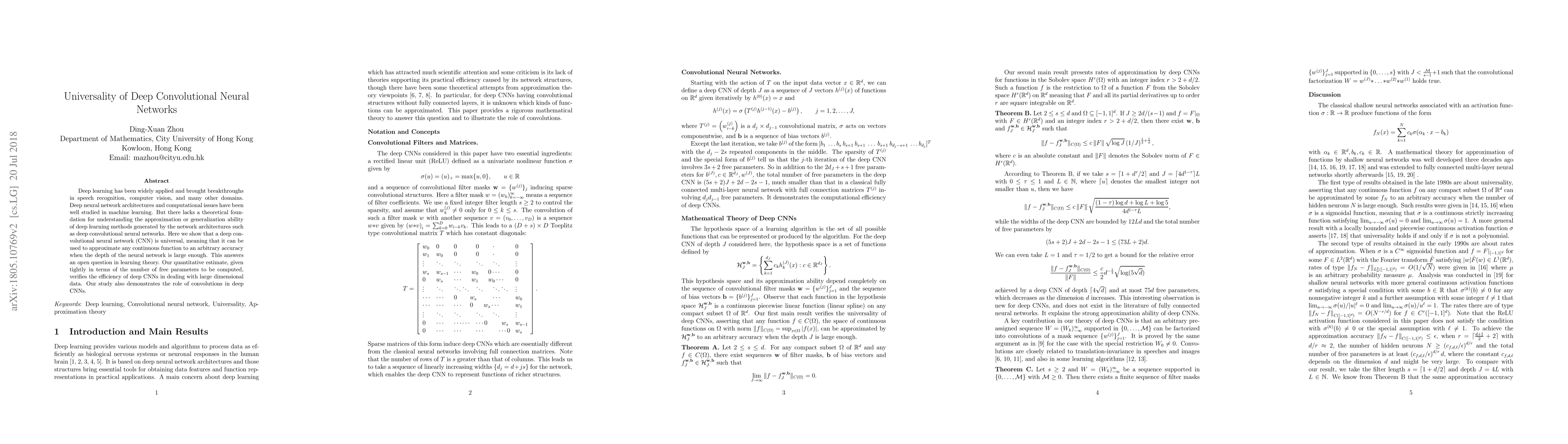 The paper demonstrates that deep convolutional neural networks (CNNs) are universal approximators, capable of approximating any continuous function to arbitrary accuracy given sufficient depth. The study provides a quantitative estimate of the number of parameters required, affirming the efficiency of CNNs in handling high-dimensional data.