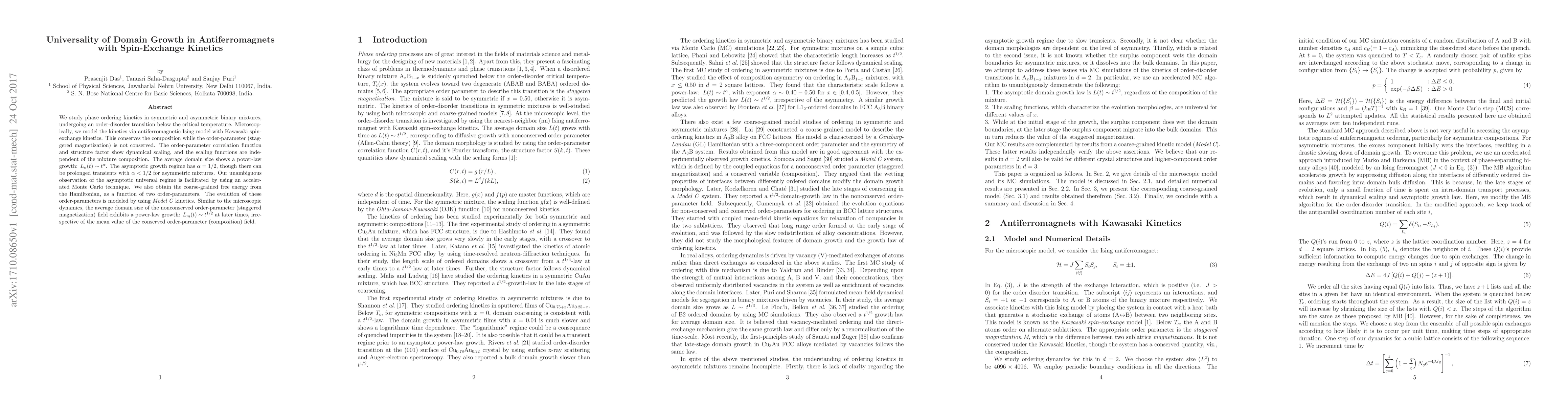 We study phase ordering kinetics in symmetric and asymmetric binary mixtures, undergoing an order-disorder transition below the critical temperature. Microscopically, we model the kinetics via antiferromagnetic Ising model with Kawasaki spin-exchange kinetics. This conserves the composition while the order-parameter (staggered magnetization) is not conserved. The order-parameter correlation function and structure factor show dynamical scaling, and the scaling functions are independent of the mixture composition. The average domain size shows a power-law growth: $L_\sigma(t)\sim t^\alpha$. The asymptotic growth regime has $\alpha=1/2$, though there can be prolonged transients with $\alpha<1/2$ for asymmetric mixtures. Our unambiguous observation of the asymptotic universal regime is facilitated by using an accelerated Monte Carlo technique. We also obtain the coarse-grained free energy from the Hamiltonian, as a function of two order-parameters. The evolution of these order-parameters is modeled by using \textit{Model C} kinetics. Similar to the microscopic dynamics, the average domain size of the nonconserved order-parameter (staggered magnetization) field exhibits a power-law growth: $L_m(t)\sim t^{1/2}$ at later times, irrespective of the mean value of the conserved order-parameter (composition) field.