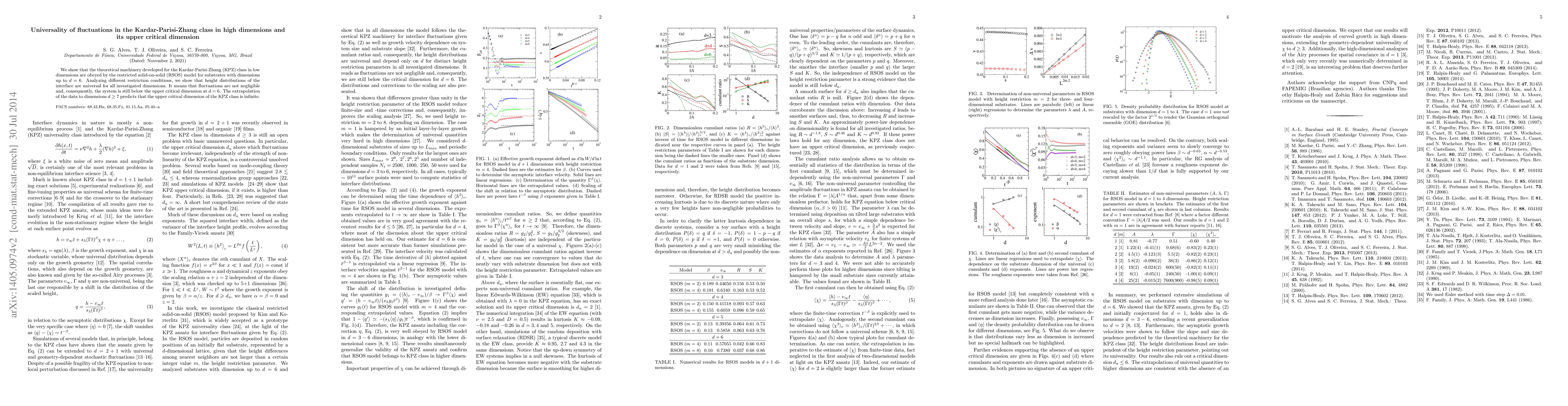 The Kardar-Parisi-Zhang class model shows universal fluctuations in dimensions up to 6, suggesting the upper critical dimension is infinite for dimensions greater than 6.