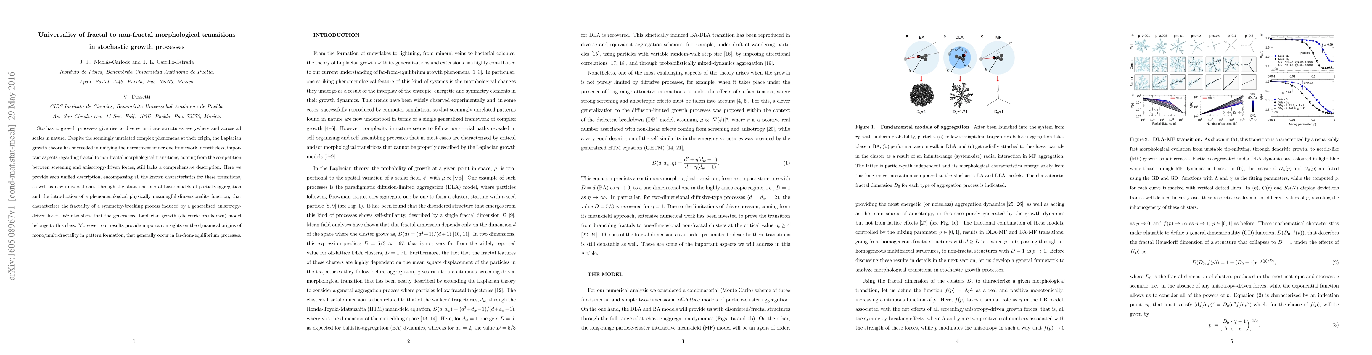 Stochastic growth processes give rise to diverse intricate structures everywhere and across all scales in nature. Despite the seemingly unrelated complex phenomena at their origin, the Laplacian growth theory has succeeded in unifying their treatment under one framework, nonetheless, important aspects regarding fractal to non-fractal morphological transitions, coming from the competition between screening and anisotropy-driven forces, still lacks a comprehensive description. Here we provide such unified description, encompassing all the known characteristics for these transitions, as well as new universal ones, through the statistical mix of basic models of particle-aggregation and the introduction of a phenomenological physically meaningful dimensionality function, that characterizes the fractality of a symmetry-breaking process induced by a generalized anisotropy-driven force. We also show that the generalized Laplacian growth (dielectric breakdown) model belongs to this class. Moreover, our results provide important insights on the dynamical origins of mono/multi-fractality in pattern formation, that generally occur in far-from-equilibrium processes.