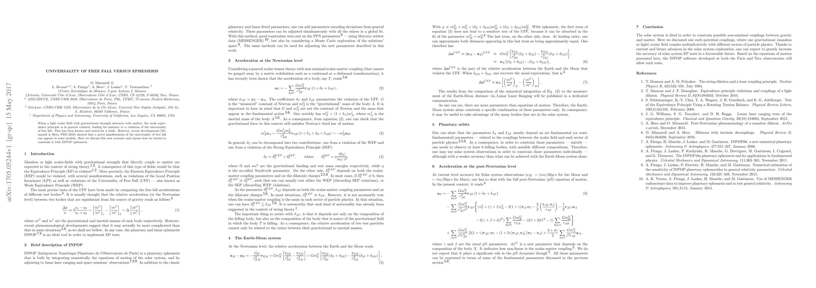The paper presents a detailed analysis of how a light scalar field with gravitational strength interacting with matter can violate the universality of free fall, proposing a method to constrain such violations using INPOP ephemeris.