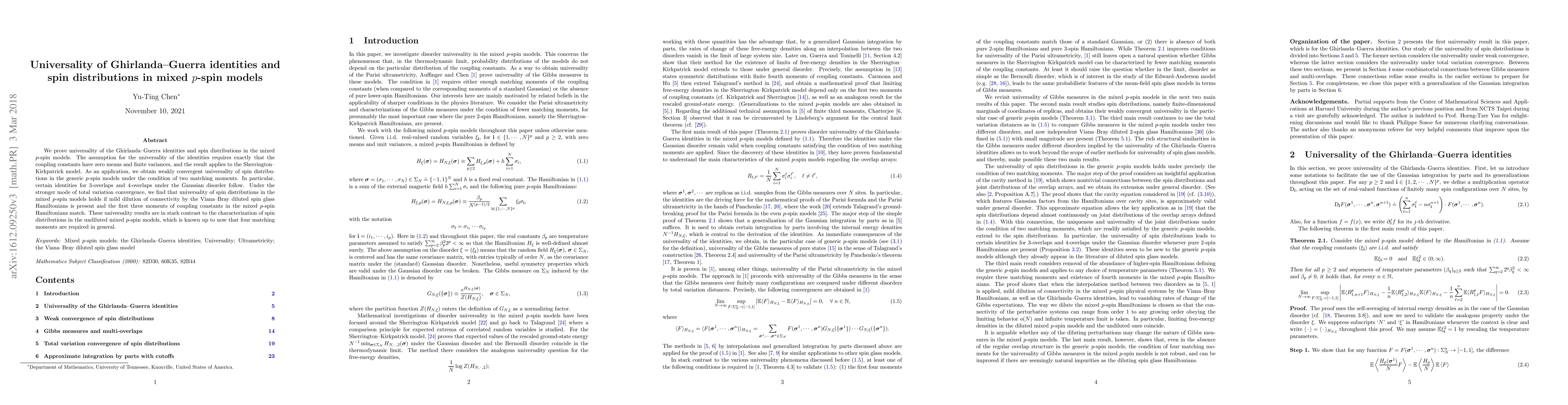 We prove universality of the Ghirlanda-Guerra identities and spin distributions in the mixed $p$-spin models. The assumption for the universality of the identities requires exactly that the coupling constants have zero means and finite variances, and the result applies to the Sherrington-Kirkpatrick model. As an application, we obtain weakly convergent universality of spin distributions in the generic $p$-spin models under the condition of two matching moments. In particular, certain identities for 3-overlaps and 4-overlaps under the Gaussian disorder follow. Under the stronger mode of total variation convergence, we find that universality of spin distributions in the mixed $p$-spin models holds if mild dilution of connectivity by the Viana-Bray diluted spin glass Hamiltonians is present and the first three moments of coupling constants in the mixed $p$-spin Hamiltonians match. These universality results are in stark contrast to the characterization of spin distributions in the undiluted mixed $p$-spin models, which is known up to now that four matching moments are required in general.