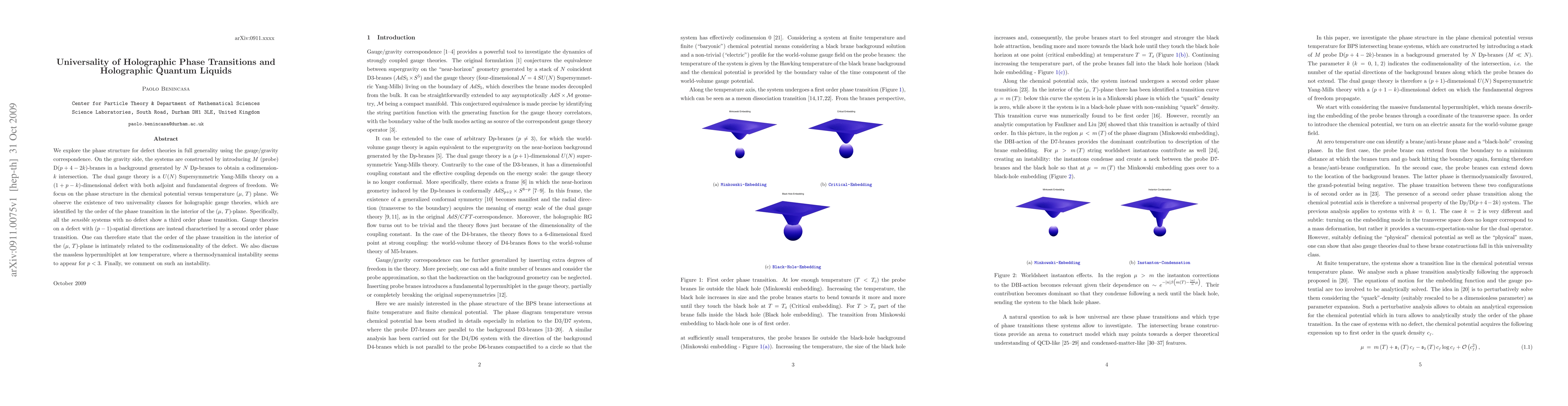 We explore the phase structure for defect theories in full generality using the gauge/gravity correspondence. On the gravity side, the systems are constructed by introducing M (probe) D(p+4-2k)-branes in a background generated by N Dp-branes to obtain a codimension-k intersection. The dual gauge theory is a U(N) Supersymmetric Yang-Mills theory on a (1+p-k)-dimensional defect with both adjoint and fundamental degrees of freedom. We focus on the phase structure in the chemical potential versus temperature plane. We observe the existence of two universality classes for holographic gauge theories, which are identified by the order of the phase transition in the interior of the chemical potential/temperature plane. Specifically, all the sensible systems with no defect show a third order phase transition. Gauge theories on a defect with (p-1)-spatial directions are instead characterised by a second order phase transition. One can therefore state that the order of this phase transition is intimately related to the codimensionality of the defect. We also discuss the massless hypermultiplet at low temperature, where a thermodynamical instability seems to appear for $p<3$. Finally, we comment on such an instability.
