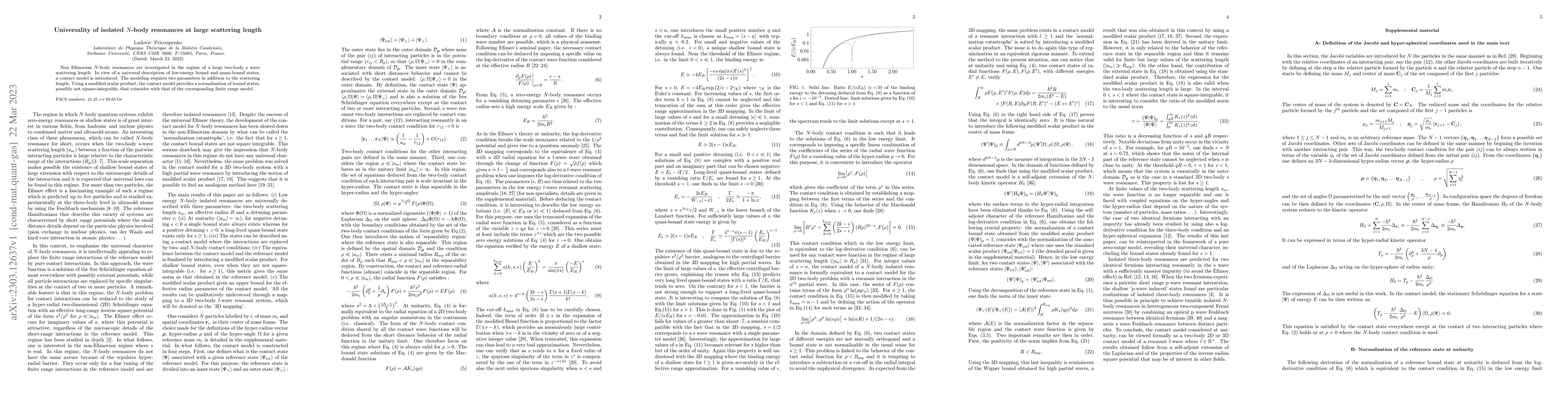 Non Efimovian $N$-body resonances are investigated in the regime of a large two-body s wave scattering length. In view of a universal description of low-energy bound and quasi-bound states, a contact model is introduced. The modeling requires two parameters in addition to the scattering length. Using a modified scalar product, the contact model provides a normalization of bound states, possibly not square-integrable, that coincides with that of the corresponding finite range model.