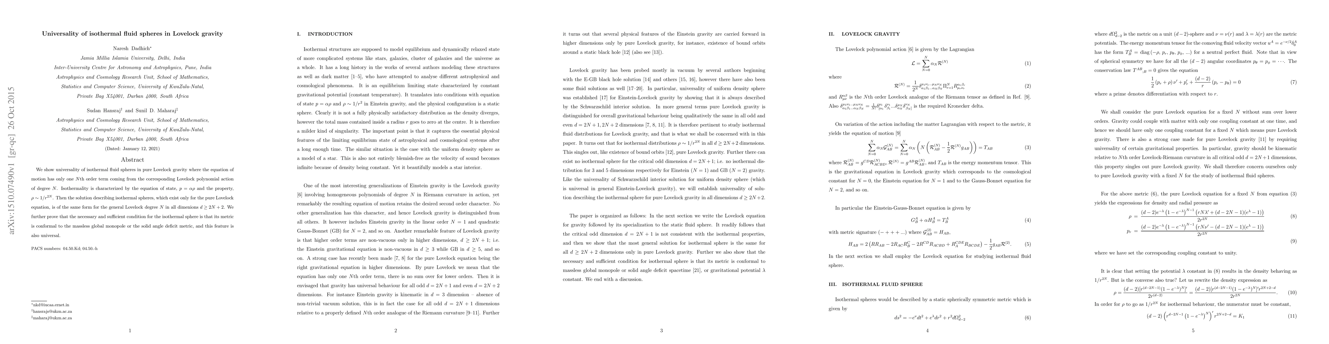 We show universality of isothermal fluid spheres in pure Lovelock gravity where the equation of motion has only one $N$th order term coming from the corresponding Lovelock polynomial action of degree $N$. Isothermality is characterized by the equation of state, $p = \alpha \rho$ and the property, $\rho \sim 1/r^{2N}$. Then the solution describing isothermal spheres, which exist only for the pure Lovelock equation, is of the same form for the general Lovelock degree $N$ in all dimenions $d \geq 2N+2$. We further prove that the necessary and sufficient condition for the isothermal sphere is that its metric is conformal to the massless global monopole or the solid angle deficit metric, and this feature is also universal.