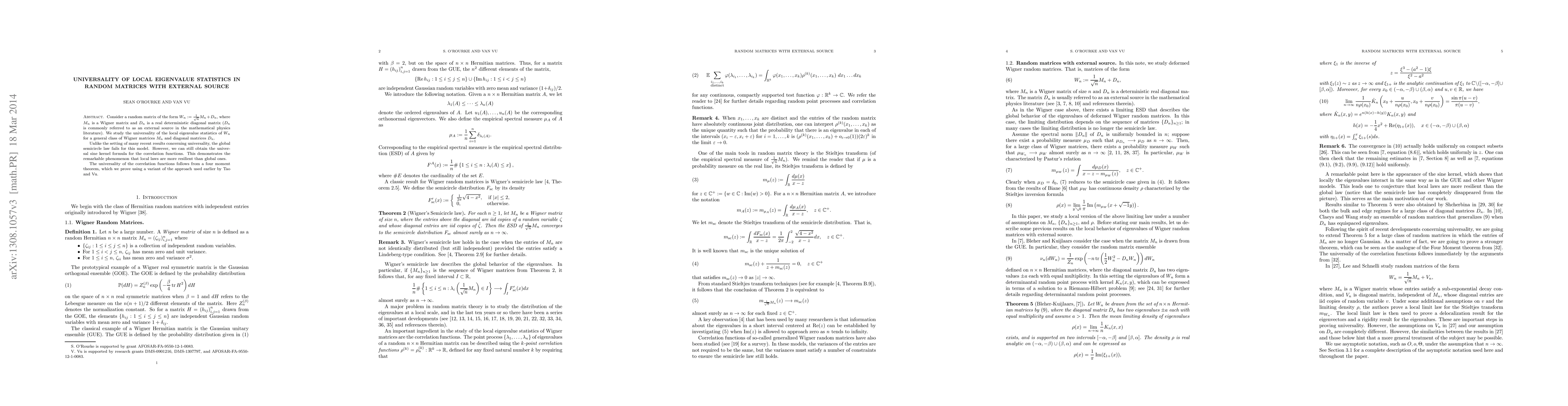 Consider a random matrix of the form $W_n = M_n + D_n$, where $M_n$ is a Wigner matrix and $D_n$ is a real deterministic diagonal matrix ($D_n$ is commonly referred to as an external source in the mathematical physics literature). We study the universality of the local eigenvalue statistics of $W_n$ for a general class of Wigner matrices $M_n$ and diagonal matrices $D_n$. Unlike the setting of many recent results concerning universality, the global semicircle law fails for this model. However, we can still obtain the universal sine kernel formula for the correlation functions. This demonstrates the remarkable phenomenon that local laws are more resilient than global ones. The universality of the correlation functions follows from a four moment theorem, which we prove using a variant of the approach used earlier by Tao and Vu.