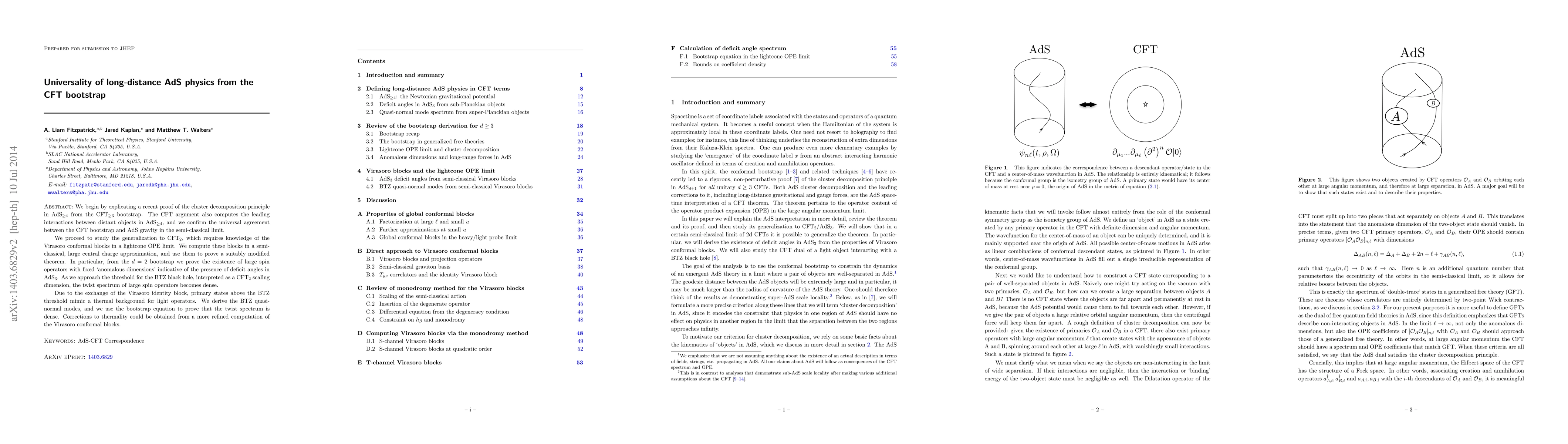 This paper demonstrates the universality of long-distance AdS physics through the CFT bootstrap, confirming the agreement between CFT and AdS gravity in the semi-classical limit. It also explores 2d CFTs and Virasoro conformal blocks, proving the existence of large spin operators indicative of deficit angles in AdS_3 and deriving BTZ quasi-normal modes.
