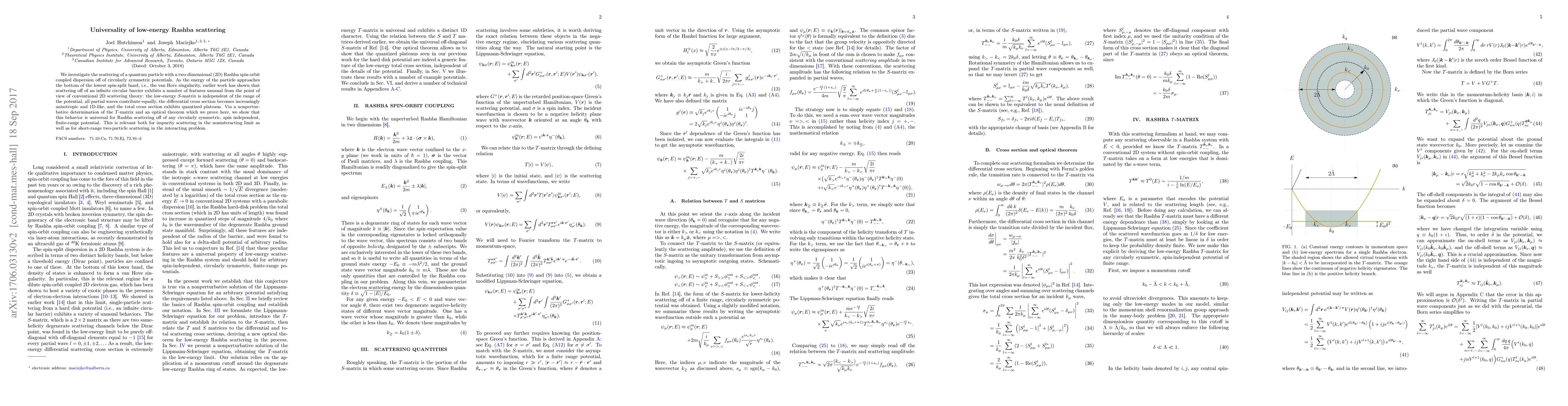 We investigate the scattering of a quantum particle with a two-dimensional (2D) Rashba spin-orbit coupled dispersion off of circularly symmetric potentials. As the energy of the particle approaches the bottom of the lowest spin-split band, i.e., the van Hove singularity, earlier work has shown that scattering off of an infinite circular barrier exhibits a number of features unusual from the point of view of conventional 2D scattering theory: the low-energy S-matrix is independent of the range of the potential, all partial waves contribute equally, the differential cross section becomes increasingly anisotropic and 1D-like, and the total cross section exhibits quantized plateaus. Via a nonperturbative determination of the T-matrix and an optical theorem which we prove here, we show that this behavior is universal for Rashba scattering off of any circularly symmetric, spin independent, finite-range potential. This is relevant both for impurity scattering in the noninteracting limit as well as for short-range two-particle scattering in the interacting problem.