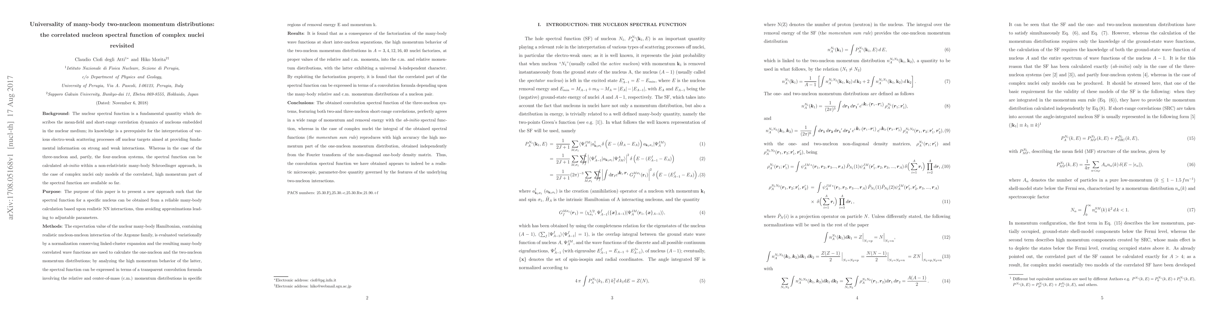 Realistic NN interactions and many-body approaches have been used to calculate ground-state properties of nuclei with A=3, 4, 12, 16, 40, with particular emphasis on various kinds of momentum distributions. It is shown that at proper values of the relative (rel) and center-of-mass (c.m.) momenta, the two-nucleon momentum distribution n_A^{N_1N_2} (k_{rel}, K_{c.m.}, \theta) exhibits the property of factorization, namely n_A^{N_1N_2} (k_{rel}, K_{c.m.}, \theta) \simeq n_{rel}(k_{rel}) n_(c.m.)( K{c.m.}). The factorization of the momentum distributions , bearing a universal character, results from a general property of realistic nuclear wave functions, namely their factorization at short inter-nucleon separations. The factorization of the two-nucleon momentum distribution allows one to develop the correlated part of the nucleon spectral function P(k,E) in terms of a convolution integral involving the product of the many-body, parameter-free relative and c.m. momentum distributions of a given nucleus. It is shown that: (i) the obtained spectral function perfectly satisfies the momentum sum rule, i.e. when it is integrated over the removal energy E, it fully reproduces the momentum distributions obtained from realistic many-body wave functions , (ii) in order to saturate the momentum sum rule at high values of the momentum (k \simeq 5 fm^{-1}) the spectral function has to be integrate up to E \simeq 400 MeV. To sum up a realistic, parameter-free many-body Spectral function has been developed such that : i) a phenomenological convolution spectral function developed in the past is fully justified from a many-body point of view , and (ii) the model dependence which might be present in calculations of inclusive electroweak processes could be reduced by the use of the convolution spectral function developed here.