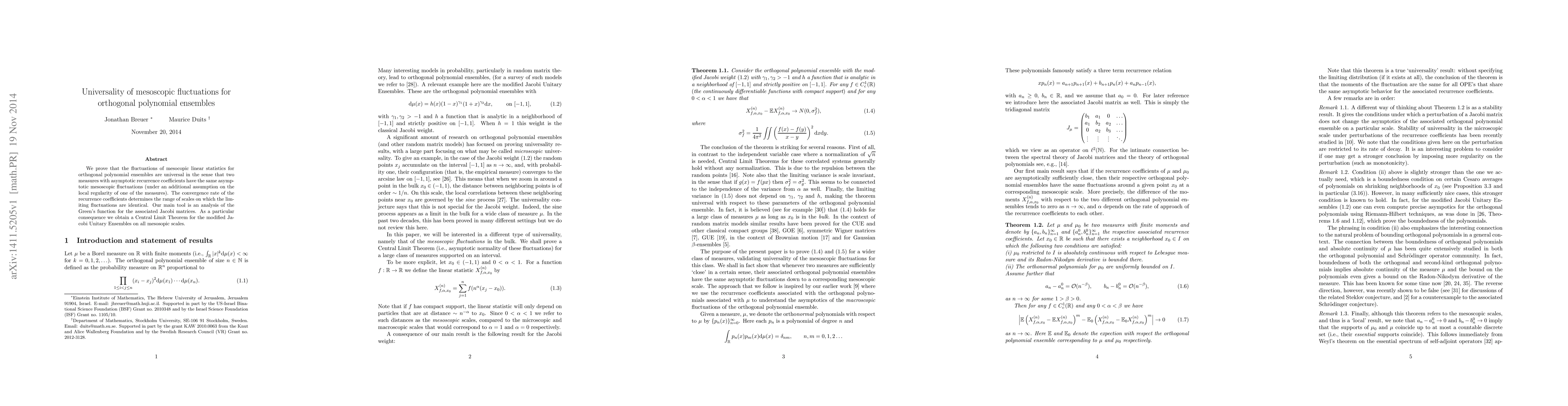 This paper proves the universality of mesoscopic fluctuations in orthogonal polynomial ensembles, showing identical asymptotic fluctuations for measures with matching recurrence coefficients. The convergence rate of these coefficients defines the scale of identical limiting fluctuations, employing an analysis of Green's functions for Jacobi matrices to achieve this result.