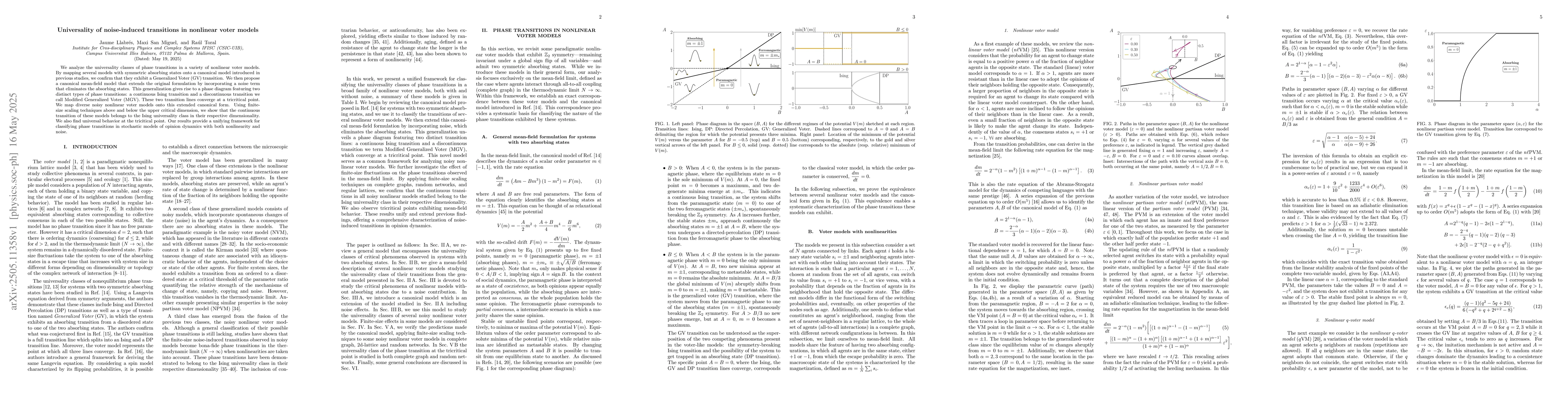 The paper unifies classification of phase transitions across diverse noisy nonlinear voter models, identifying universal behavior at critical points and linking continuous transitions to the Ising universality class.