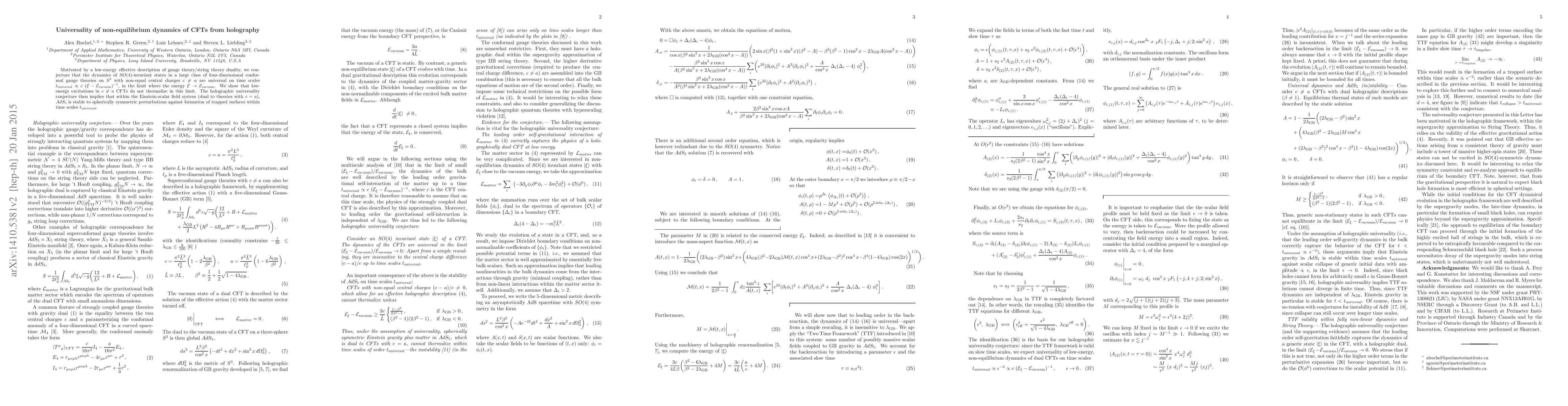 Motivated by a low-energy effective description of gauge theory/string theory duality, we conjecture that the dynamics of $SO(4)$-invariant states in a large class of four-dimensional conformal gauge theories on $S^3$ with non-equal central charges $c\ne a$ are universal on time scales $t_{\rm universal}\propto ({\cal E}-{\cal E}_{\rm vacuum})^{-1}$, in the limit where the energy ${\cal E}\to {\cal E}_{\rm vacuum}$. We show that low-energy excitations in $c\ne a$ CFTs do not thermalize in this limit. The holographic universality conjecture then implies that within the Einstein-scalar field system (dual to theories with $c=a$), $AdS_5$ is stable to spherically symmetric perturbations against formation of trapped surfaces within time scales $t_{\rm universal}$.