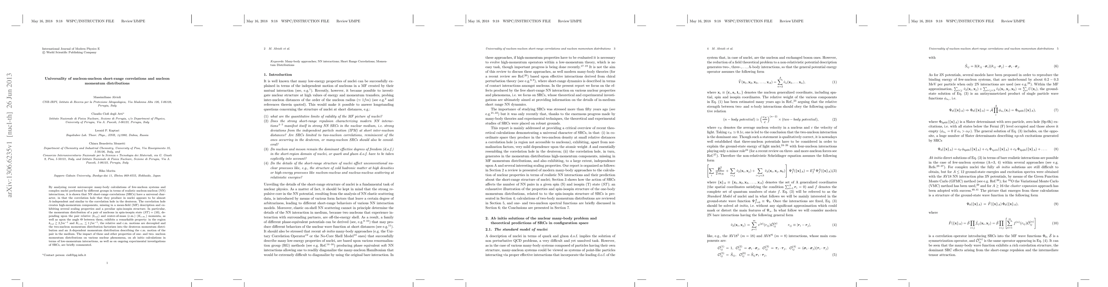 By analyzing recent microscopic many-body calculations of few-nucleon systems and complex nuclei performed by different groups in terms of realistic nucleon-nucleon (NN) interactions, it is shown that NN short-range correlations (SRCs) have a universal character, in that the correlation hole that they produce in nuclei appears to be almost A-independent and similar to the correlation hole in the deuteron. The correlation hole creates high-momentum components, missing in a mean-field (MF) description and exhibiting several scaling properties and a peculiar spin-isospin structure. In particular, the momentum distribution of a pair of nucleons in spin-isospin state $(ST)=(10)$, depending upon the pair relative ($k_{rel}$) and center-of-mass (c.m.) ($K_{c.m.}$) momenta, as well as upon the angle $\Theta$ between them, exhibits a remarkable property: in the region $k_{rel}\gtrsim 2\,fm^{-1}$ and $K_{c.m.}\lesssim 1\,fm^{-1} $, the relative and c.m. motions are decoupled and the two-nucleon momentum distribution factorizes into the deuteron momentum distribution and an A-dependent momentum distribution describing the c.m. motion of the pair in the medium. The impact of these and other properties of one- and two-nucleon momentum distributions on various nuclear phenomena, on ab initio calculations in terms of low-momentum interactions, as well as on ongoing experimental investigations of SRCs, are briefly commented.