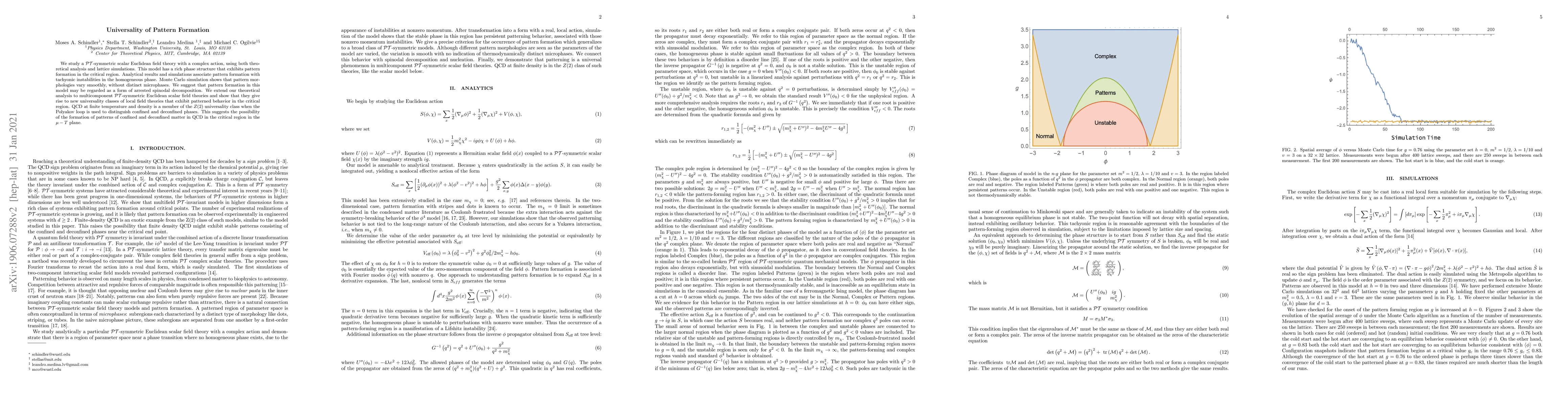 We study a $\mathcal PT$-symmetric scalar Euclidean field theory with a complex action, using both theoretical analysis and lattice simulations. This model has a rich phase structure that exhibits pattern formation in the critical region. Analytical results and simulations associate pattern formation with tachyonic instabilities in the homogeneous phase. Monte Carlo simulation shows that pattern morphologies vary smoothly, without distinct microphases. We suggest that pattern formation in this model may be regarded as a form of arrested spinodal decomposition. We extend our theoretical analysis to multicomponent $\mathcal PT$-symmetric Euclidean scalar field theories and show that they give rise to new universality classes of local field theories that exhibit patterned behavior in the critical region. QCD at finite temperature and density is a member of the $Z(2)$ universality class when the Polyakov loop is used to distinguish confined and deconfined phases. This suggests the possibility of the formation of patterns of confined and deconfined matter in QCD in the critical region in the $\mu-T$ plane.