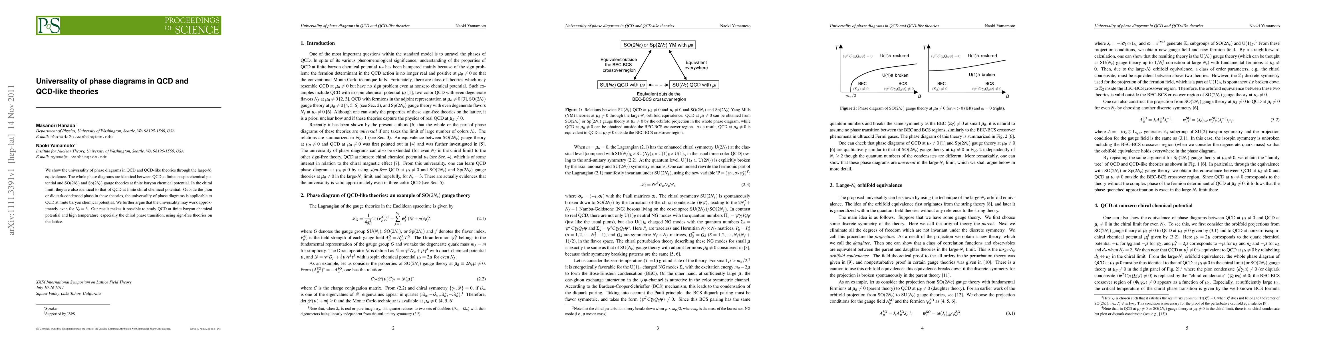 The paper demonstrates the universality of phase diagrams across QCD and related gauge theories through large-N_c equivalence, showing identical behavior in finite chemical potential conditions. It suggests that these similarities extend even to N_c=3 and enable lattice studies of QCD under high baryonic conditions.