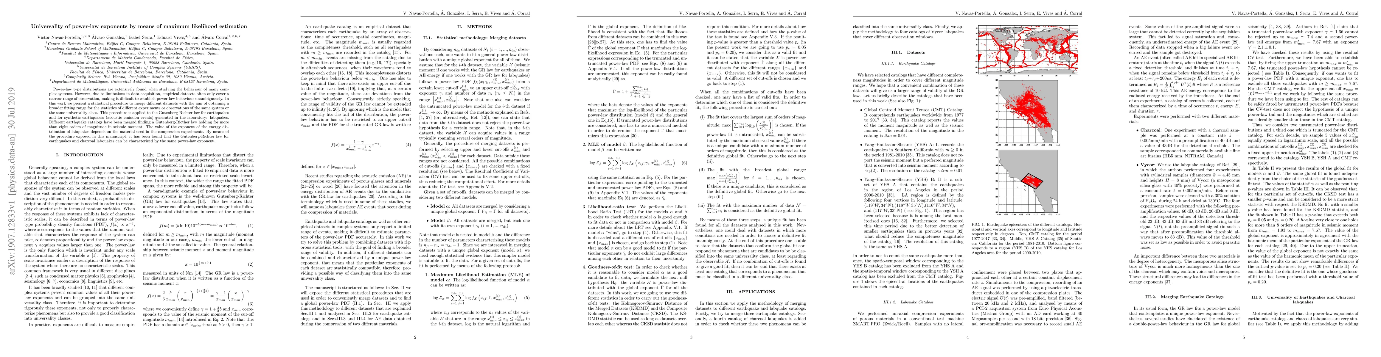 Power-law type distributions are extensively found when studying the behaviour of many complex systems. However, due to limitations in data acquisition, empirical datasets often only cover a narrow range of observation, making it difficult to establish power-law behaviour unambiguously. In this work we present a statistical procedure to merge different datasets with the aim of obtaining a broader fitting range for the statistics of different experiments or observations of the same system or the same universality class. This procedure is applied to the Gutenberg-Richter law for earthquakes and for synthetic earthquakes (acoustic emission events) generated in the laboratory: labquakes. Different earthquake catalogs have been merged finding a Gutenberg-Ricther law holding for more than eight orders of magnitude in seismic moment. The value of the exponent of the energy distribution of labquakes depends on the material used in the compression experiments. By means of the procedure exposed in this manuscript, it has been found that the Gutenberg-Richter law for earthquakes and charcoal labquakes can be characterized by the same power-law exponent.