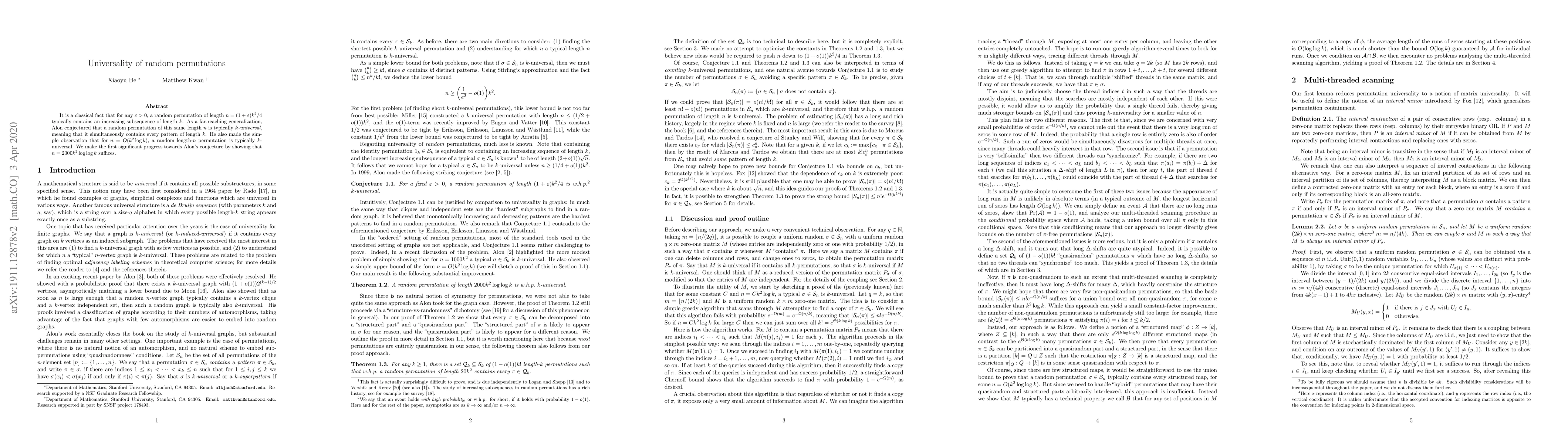 A new bound for random permutations has been found to be sufficient for proving a conjecture about their universality, specifically showing that a permutation of length $n = 2000 k^2 ext{log} ext{log} k$ is typically $k$-universal.
