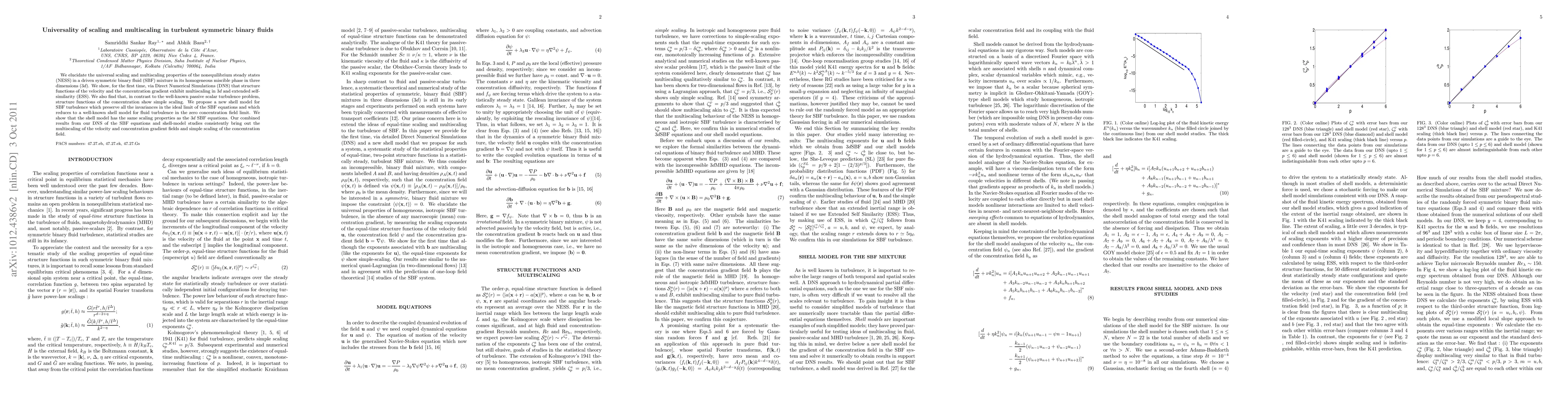This paper investigates the scaling and multiscaling behaviors in turbulent symmetric binary fluid mixtures, revealing via simulations that velocity and concentration gradient fields exhibit multiscaling and extended self-similarity, while concentration fields show simple scaling. It proposes a new shell model that maintains the invariances of the fluid equations and matches the scaling properties observed.