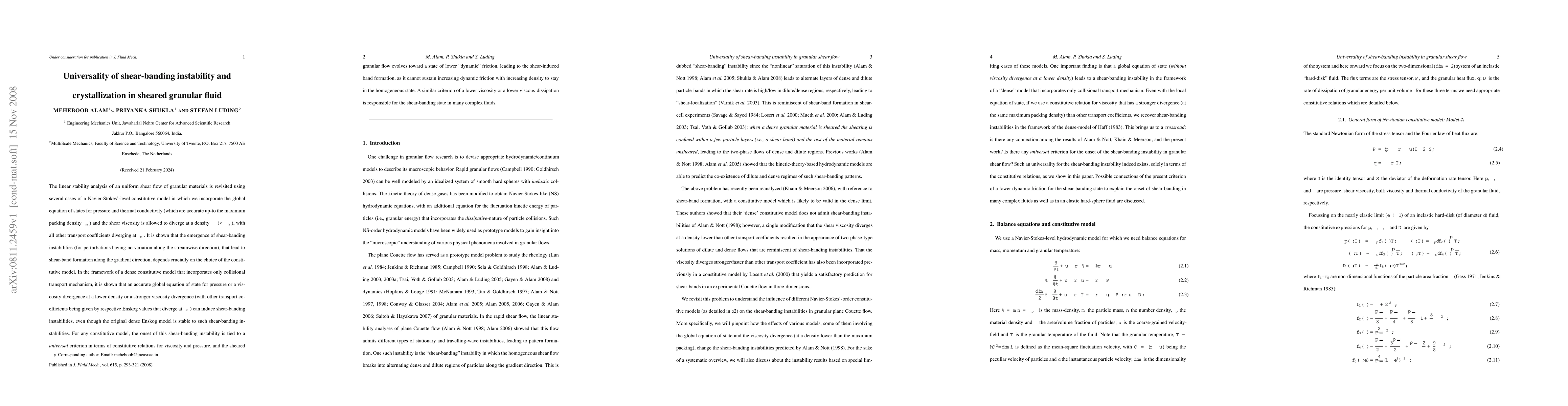 The linear stability analysis of an uniform shear flow of granular materials is revisited using several cases of a Navier-Stokes'-level constitutive model in which we incorporate the global equation of states for pressure and thermal conductivity (which are accurate up-to the maximum packing density $\nu_{m}$) and the shear viscosity is allowed to diverge at a density $\nu_\mu$ ($< \nu_{m}$), with all other transport coefficients diverging at $\nu_{m}$. It is shown that the emergence of shear-banding instabilities (for perturbations having no variation along the streamwise direction), that lead to shear-band formation along the gradient direction, depends crucially on the choice of the constitutive model. In the framework of a dense constitutive model that incorporates only collisional transport mechanism, it is shown that an accurate global equation of state for pressure or a viscosity divergence at a lower density or a stronger viscosity divergence (with other transport coefficients being given by respective Enskog values that diverge at $\nu_m$) can induce shear-banding instabilities, even though the original dense Enskog model is stable to such shear-banding instabilities. For any constitutive model, the onset of this shear-banding instability is tied to a {\it universal} criterion in terms of constitutive relations for viscosity and pressure, and the sheared granular flow evolves toward a state of lower "dynamic" friction, leading to the shear-induced band formation, as it cannot sustain increasing dynamic friction with increasing density to stay in the homogeneous state. A similar criterion of a lower viscosity or a lower viscous-dissipation is responsible for the shear-banding state in many complex fluids.
