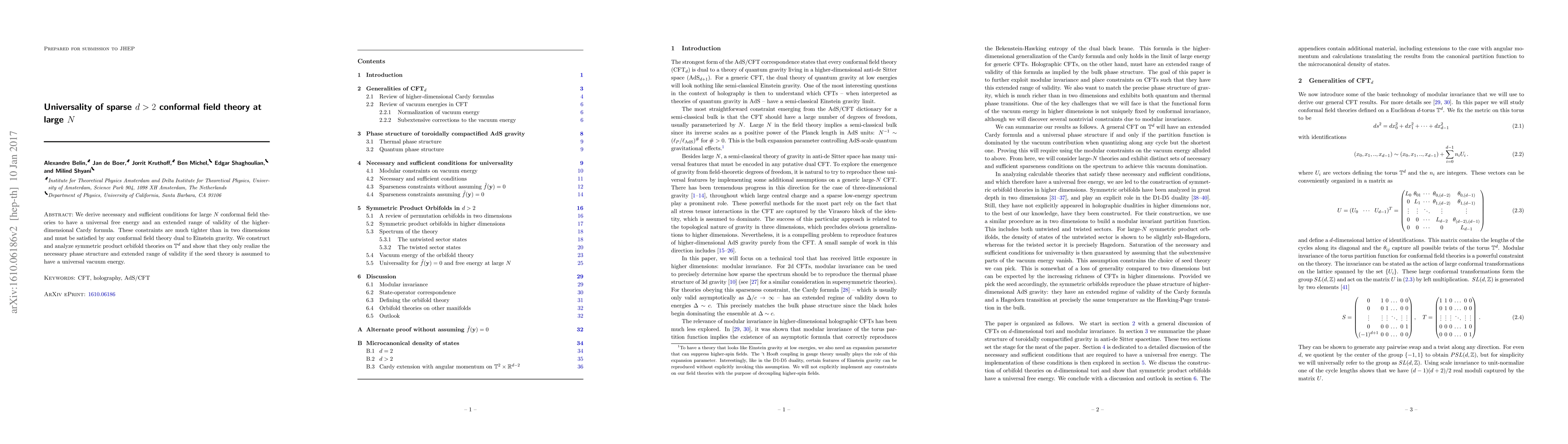 The paper presents a detailed derivation of conditions for universal free energy and extended Cardy formula validity in higher-dimensional conformal field theories at large N, along with the construction and analysis of symmetric product orbifold theories on T^d.