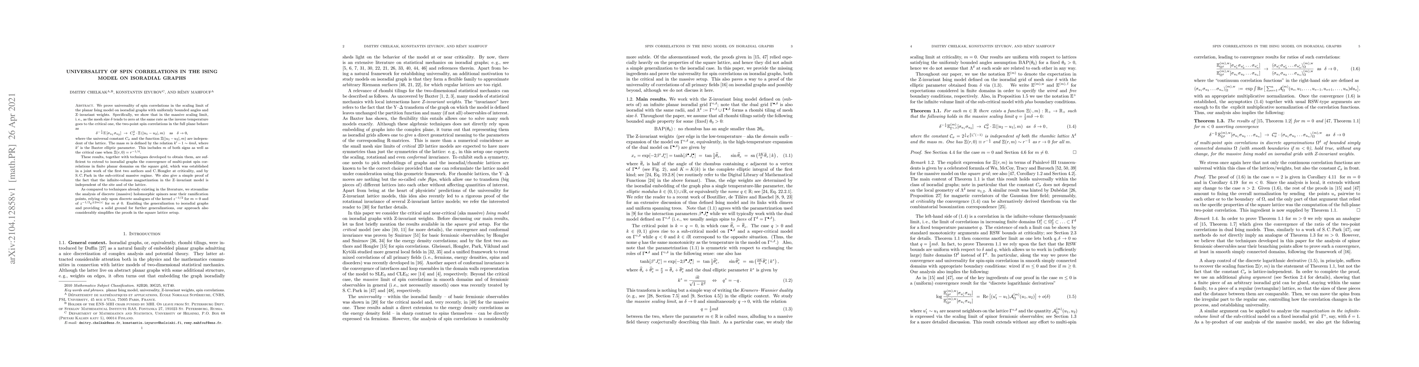 We prove universality of spin correlations in the scaling limit of the planar Ising model on isoradial graphs with uniformly bounded angles and Z-invariant weights. Specifically, we show that in the massive scaling limit, i.e., as the mesh size $\delta$ tends to zero at the same rate as the inverse temperature goes to the critical one, the two-point spin correlations in the full plane behave as \[ \delta^{-\frac{1}{4}}\mathbb{E}\left[\sigma_{u_{1}}\sigma_{u_{2}}\right]\ \to\ C_{\sigma}^{2}\cdot\Xi\left(|u_{1}-u_{2}|,m\right)\quad\text{as}\quad\delta\to0, \] where the universal constant $C_{\sigma}$ and the function $\Xi(|u_{1}-u_{2}|,m)$ are independent of the lattice. The mass $m$ is defined by the relation $k'-1\sim 4m\delta$, where $k'$ is the Baxter elliptic parameter. This includes $m$ of both signs as well as the critical case when $\Xi(r,0)=r^{-1/4}.$ These results, together with techniques developed to obtain them, are sufficient to extend to isoradial graphs the convergence of multi-point spin correlations in finite planar domains on the square grid, which was established in a joint work of the first two authors and C. Hongler at criticality, and by S.C. Park in the sub-critical massive regime. We also give a simple proof of the fact that the infinite-volume magnetization in the Z-invariant model is independent of the site and of the lattice. As compared to techniques already existing in the literature, we streamline the analysis of discrete (massive) holomorphic spinors near their ramification points, relying only upon discrete analogues of the kernel $z^{-1/2}$ for $m=0$ and of $z^{-1/2}e^{\pm 2m|z|}$ for $m\ne 0$. Enabling the generalization to isoradial graphs and providing a solid ground for further generalizations, our approach also considerably simplifies the proofs in the square lattice setup.
