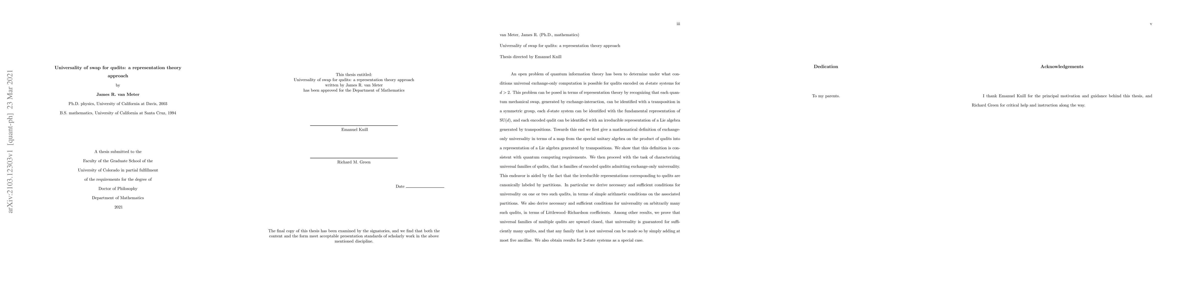 This paper addresses the universality of quantum swap operations for qudits using representation theory, defining exchange-only universality and deriving conditions for its realization. It provides necessary and sufficient conditions for universality in terms of partitions and Littlewood-Richardson coefficients, proving that universal families of qudits are upward closed and can be extended to include non-universal families with minimal additional resources.
