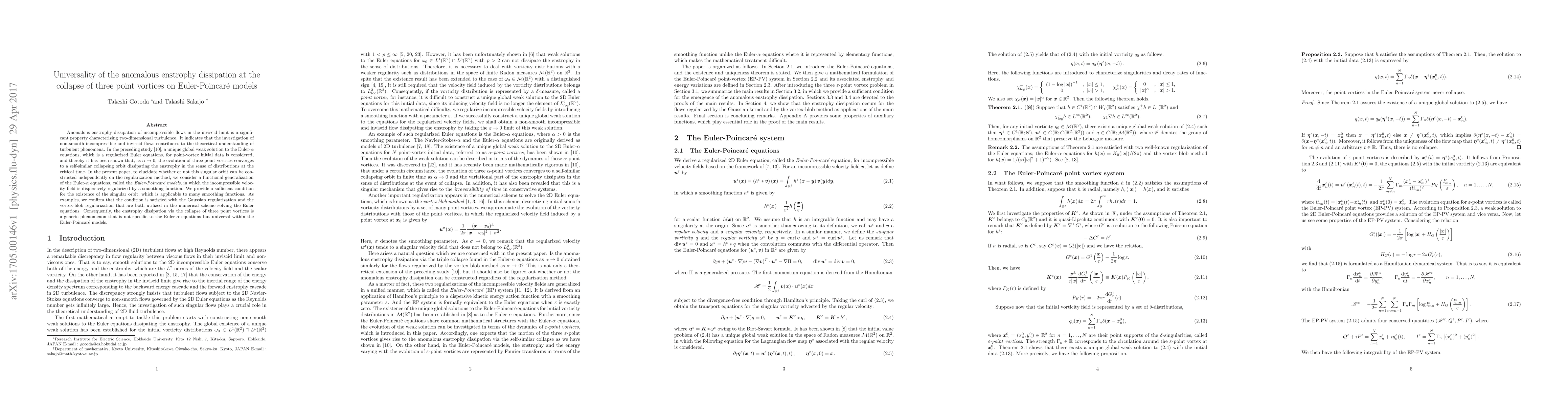 Anomalous enstrophy dissipation of incompressible flows in the inviscid limit is a significant property characterizing two-dimensional turbulence. It indicates that the investigation of non-smooth incompressible and inviscid flows contributes to the theoretical understanding of turbulent phenomena. In the preceding study, a unique global weak solution to the Euler-$\alpha$ equations, which is a regularized Euler equations, for point-vortex initial data is considered, and thereby it has been shown that, as $\alpha \rightarrow 0$, the evolution of three point vortices converges to a self-similar collapsing orbit dissipating the enstrophy in the sense of distributions at the critical time. In the present paper, to elucidate whether or not this singular orbit can be constructed independently on the regularization method, we consider a functional generalization of the Euler-$\alpha$ equations, called the \textit{Euler-Poincar\'{e} models}, in which the incompressible velocity field is dispersively regularized by a smoothing function. We provide a sufficient condition for the existence of the singular orbit, which is applicable to many smoothing functions. As examples, we confirm that the condition is satisfied with the Gaussian regularization and the vortex-blob regularization that are both utilized in the numerical scheme solving the Euler equations. Consequently, the enstrophy dissipation via the collapse of three point vortices is a generic phenomenon that is not specific to the Euler-$\alpha$ equations but universal within the Euler-Poincar\'{e} models.