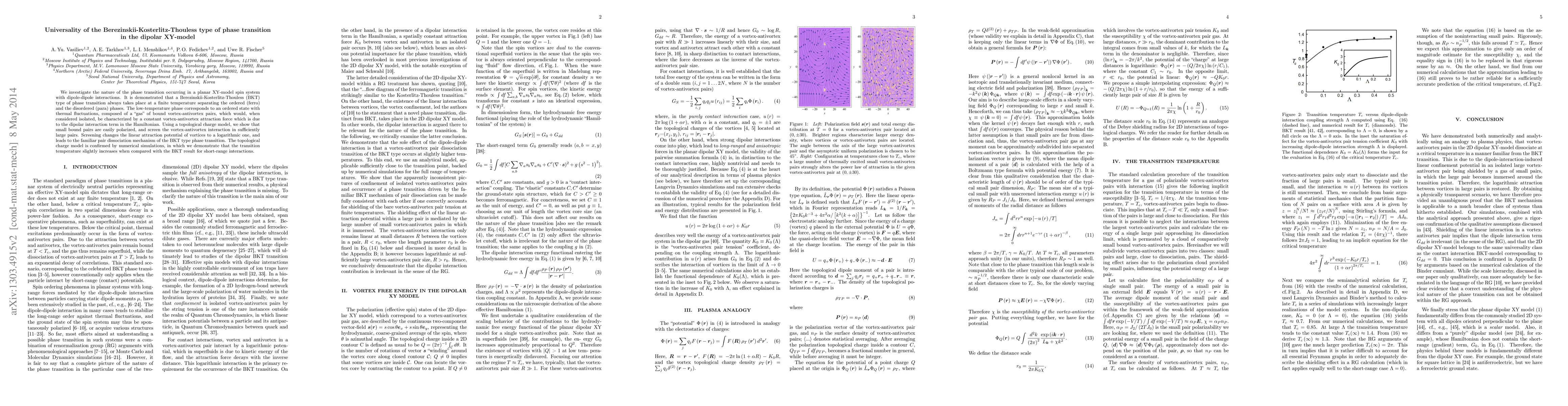 This paper explores the Berezinskii-Kosterlitz-Thouless (BKT) phase transition in a planar XY-model with dipole-dipole interactions, demonstrating that it separates ordered and disordered phases at a finite temperature. The transition is characterized by a logarithmic potential due to screening effects in vortex-antivortex pairs, confirmed by numerical simulations.