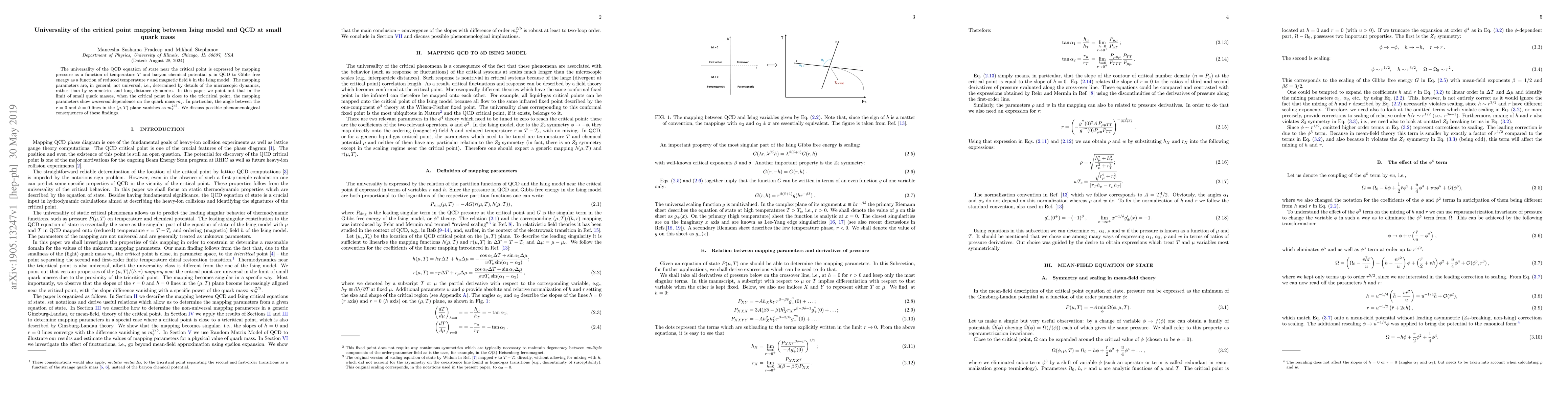 This paper explores the universality of the critical point mapping between the Ising model and QCD at small quark mass, revealing that the mapping parameters exhibit universal dependence on quark mass when the critical point approaches the tricritical point. The angle between the $r=0$ and $h=0$ lines vanishes as $m_q^{2/5}$, suggesting significant phenomenological implications.