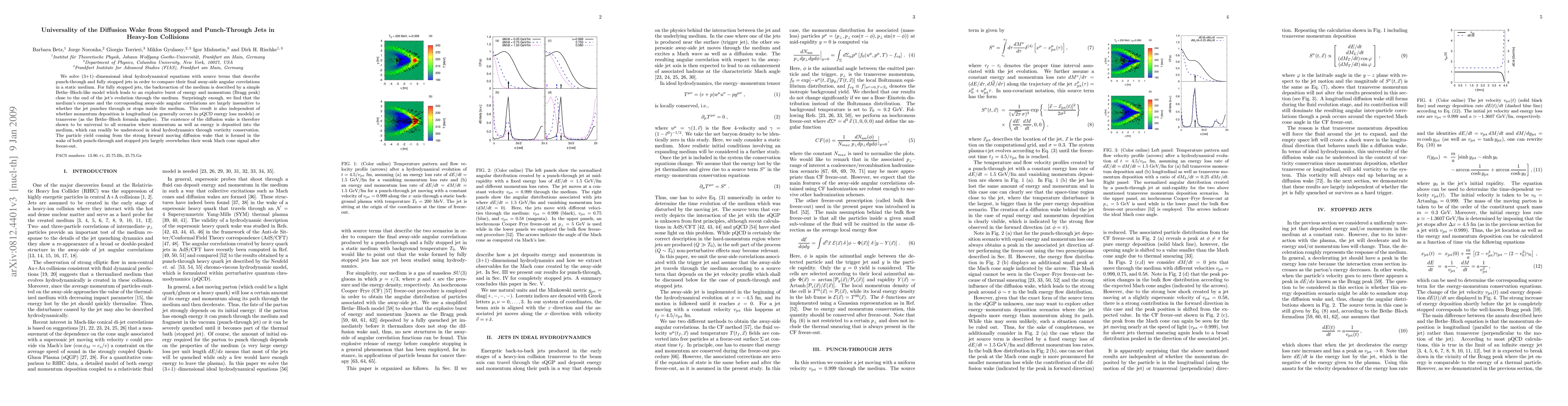 We solve (3+1)-dimensional ideal hydrodynamical equations with source terms that describe punch-through and fully stopped jets in order to compare their final away-side angular correlations in a static medium. For fully stopped jets, the backreaction of the medium is described by a simple Bethe-Bloch-like model which leads to an explosive burst of energy and momentum (Bragg peak) close to the end of the jet's evolution through the medium. Surprisingly enough, we find that the medium's response and the corresponding away-side angular correlations are largely insensitive to whether the jet punches through or stops inside the medium. This result is also independent of whether momentum deposition is longitudinal (as generally occurs in pQCD energy loss models) or transverse (as the Bethe-Bloch formula implies). The existence of the diffusion wake is therefore shown to be universal to all scenarios where momentum as well as energy is deposited into the medium, which can readily be understood in ideal hydrodynamics through vorticity conservation. The particle yield coming from the strong forward moving diffusion wake that is formed in the wake of both punch-through and stopped jets largely overwhelms their weak Mach cone signal after freeze-out.