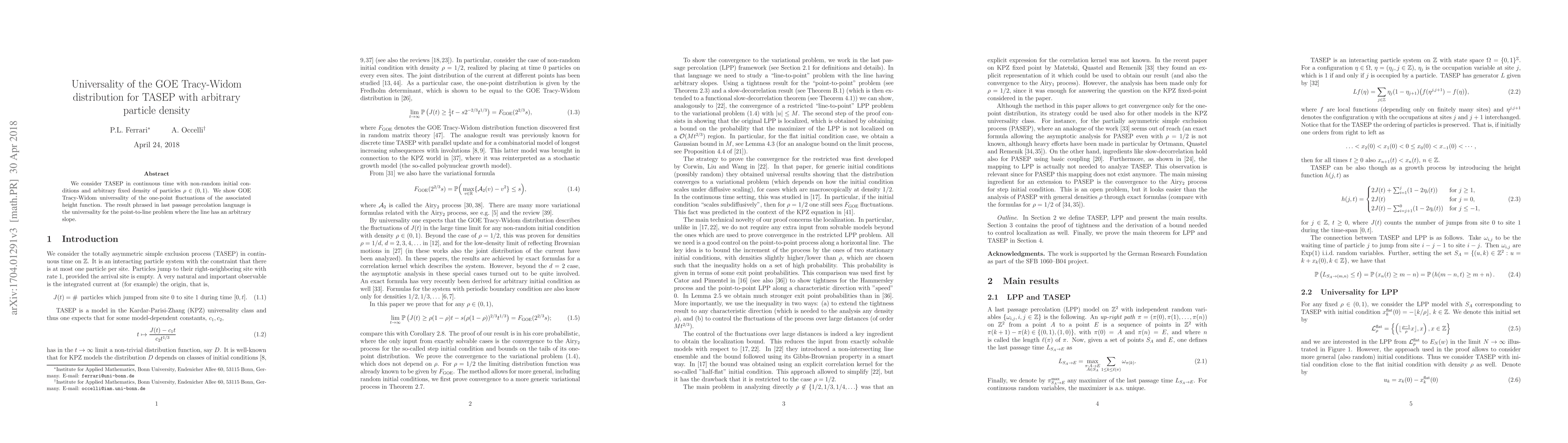 This paper demonstrates the GOE Tracy-Widom distribution's universality for the one-point fluctuations of the height function in TASEP with continuous time and arbitrary particle density. It extends this result to the point-to-line problem in last passage percolation with an arbitrary slope.