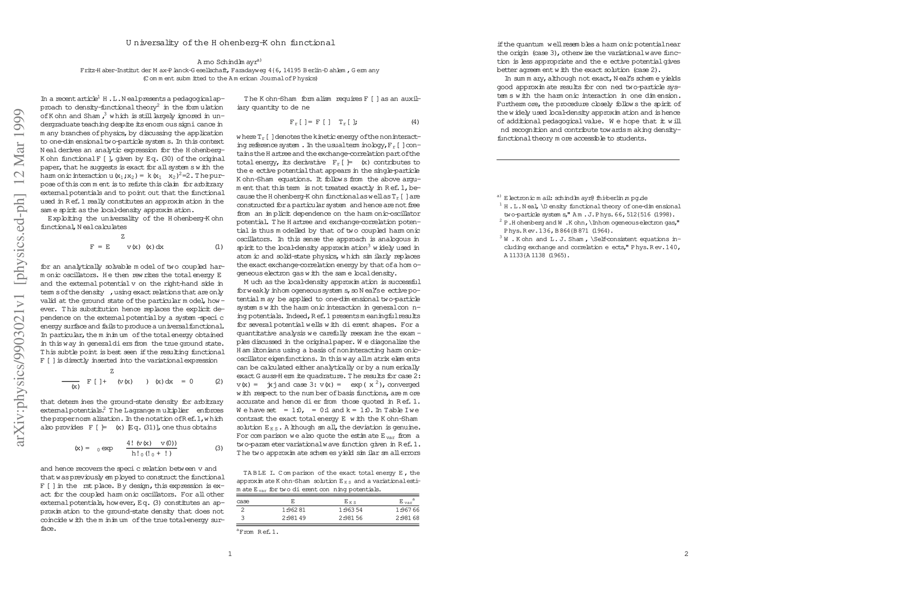 We comment on a recent article by H. L. Neal [Am. J. Phys. 66, 512 (1998)], in which an analytic expression for the Hohenberg-Kohn functional was derived for one-dimensional two-particle systems with the harmonic interaction. We argue that the functional given by Neal is not exact but really constitutes an approximation in the same spirit as the local-density approximation.