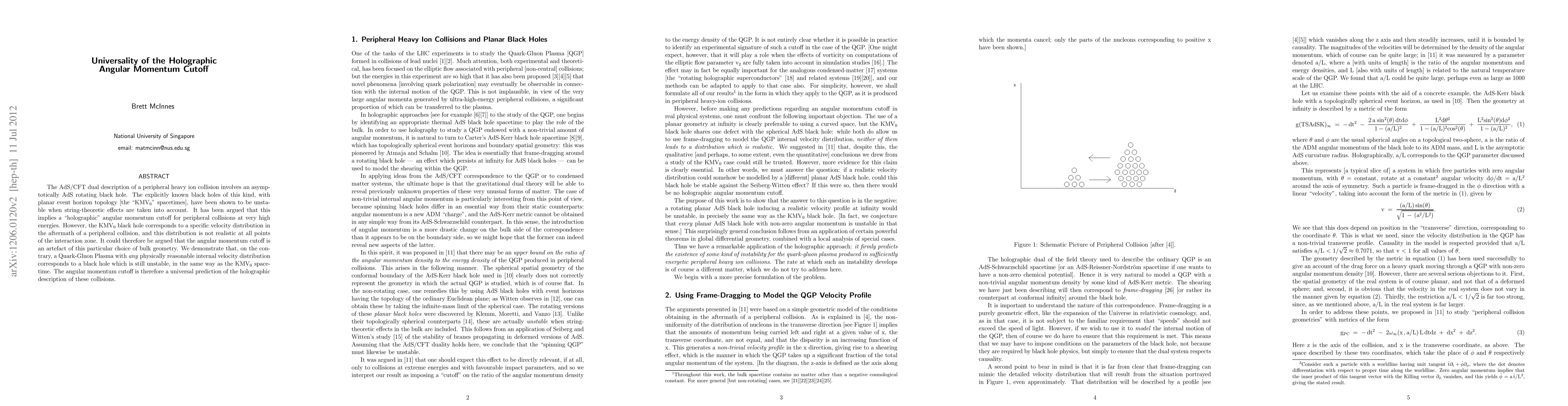 The AdS/CFT dual description of a peripheral heavy ion collision involves an asymptotically AdS rotating black hole. The explicitly known black holes of this kind, with planar event horizon topology [the "KMV$_0$" spacetimes], have been shown to be unstable when string-theoretic effects are taken into account. It has been argued that this implies a "holographic" angular momentum cutoff for peripheral collisions at very high energies. However, the KMV$_0$ black hole corresponds to a specific velocity distribution in the aftermath of a peripheral collision, and this distribution is not realistic at all points of the interaction zone. It could therefore be argued that the angular momentum cutoff is an artefact of this particular choice of bulk geometry. We demonstrate that, on the contrary, a Quark-Gluon Plasma with any physically reasonable internal velocity distribution corresponds to a black hole which is still unstable, in the same way as the KMV$_0$ spacetime. The angular momentum cutoff is therefore a universal prediction of the holographic description of these collisions.