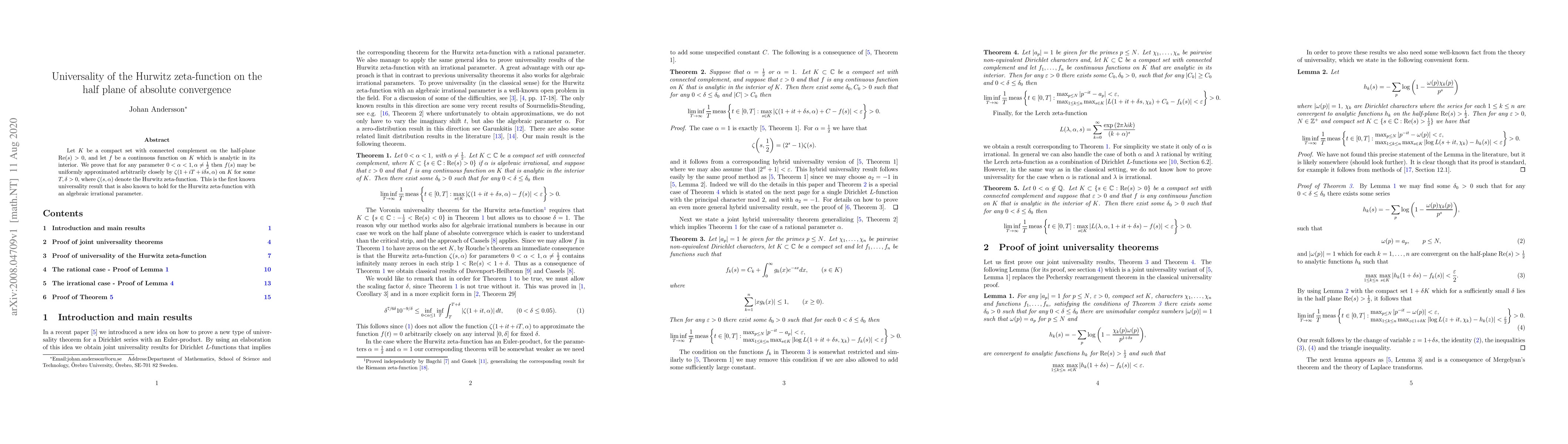 Let $K$ be a compact set with connected complement on the half-plane Re$(s)>0$, and let $f$ be a continuous function on $K$ which is analytic in its interior. We prove that for any parameter $0<\alpha<1, \alpha \neq \frac 1 2$ then $f(s)$ may be uniformly approximated arbitrarily closely by $\zeta(1+iT+i\delta s,\alpha)$ on $K$ for some $T,\delta>0$, where $\zeta(s,\alpha)$ denote the Hurwitz zeta-function. This is the first known universality result that is also known to hold for the Hurwitz zeta-function with an algebraic irrational parameter.