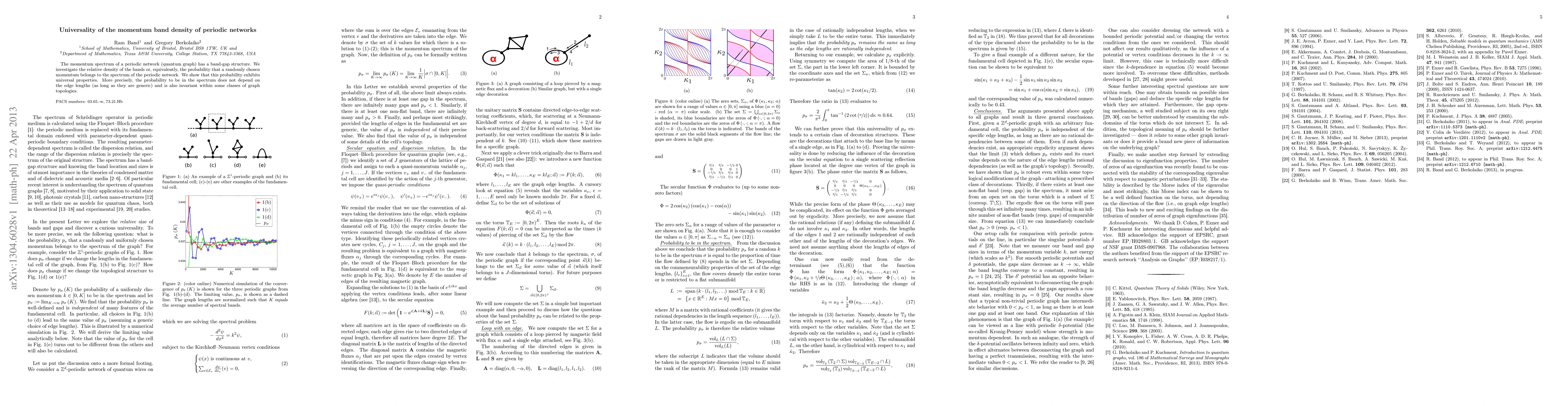 The momentum spectrum of a periodic network (quantum graph) has a band-gap structure. We investigate the relative density of the bands or, equivalently, the probability that a randomly chosen momentum belongs to the spectrum of the periodic network. We show that this probability exhibits universal properties. More precisely, the probability to be in the spectrum does not depend on the edge lengths (as long as they are generic) and is also invariant within some classes of graph topologies.