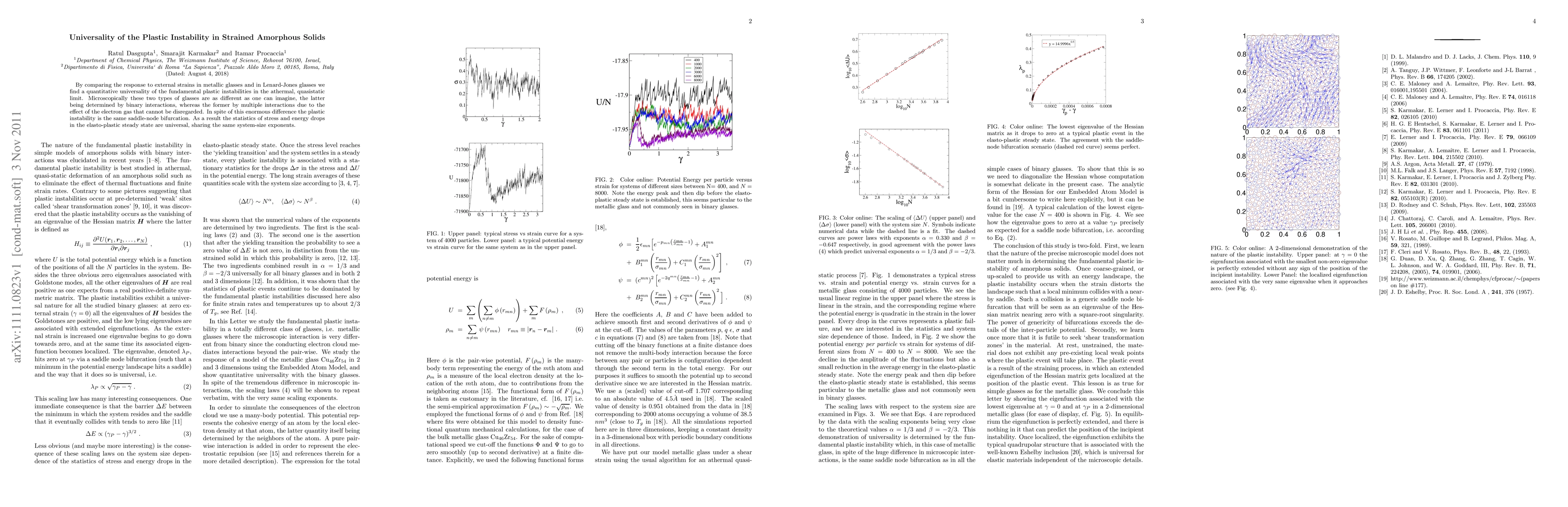 Researchers found a universal plastic instability in strained amorphous solids, including metallic glasses and Lenard-Jones glasses, with the same saddle-node bifurcation, despite their different microscopic structures.