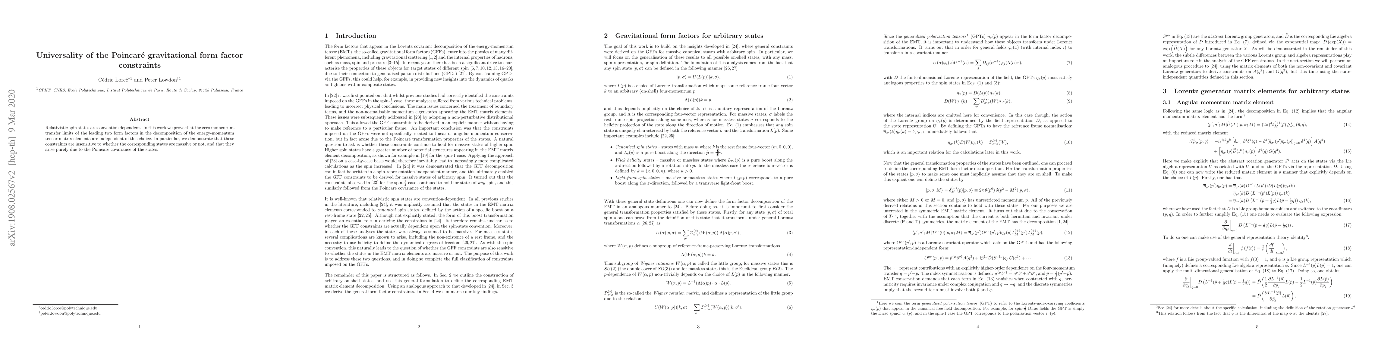This research proves that the zero momentum-transfer limits of the leading two form factors in the decomposition of the energy-momentum tensor matrix elements are universal, independent of spin state convention. This universality arises from Poincar'e covariance, not the mass of the states.