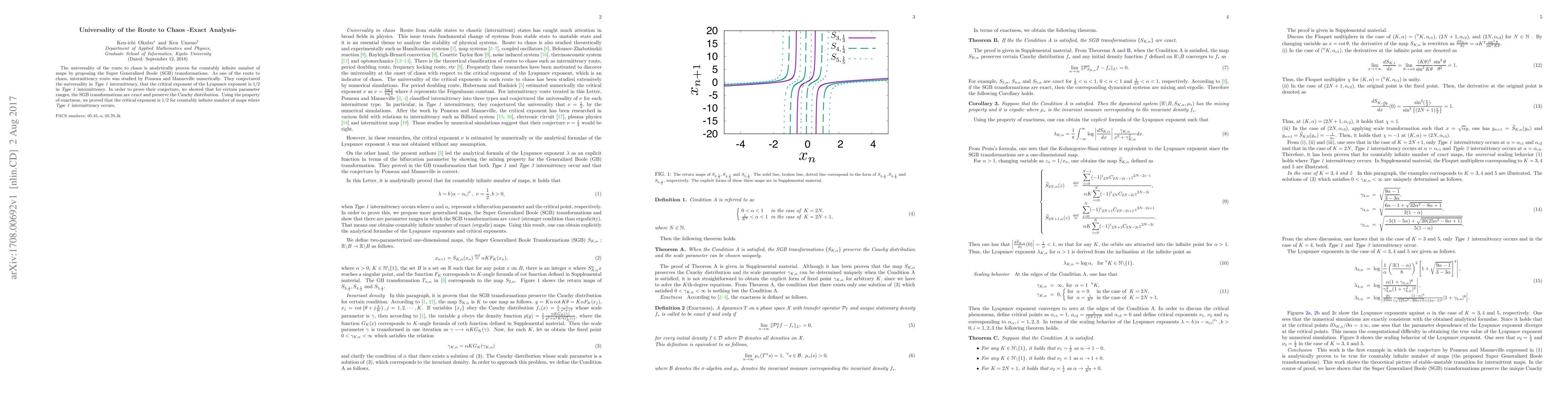 The universality of the route to chaos is analytically proven for countably infinite number of maps by proposing the Super Generalized Boole (SGB) transformations. As one of the route to chaos, intermittency route was studied by Pomeau and Manneville numerically. They conjectured the universality in Type 1 intermittency, that the critical exponent of the Lyapunov exponent is $1/2$ in Type 1 intermittency. In order to prove their conjecture, we showed that for certain parameter ranges, the SGB transformations are exact and preserve the Cauchy distribution. Using the property of exactness, we proved that the critical exponent is $1/2$ for countably infinite number of maps where Type 1 intermittency occurs.