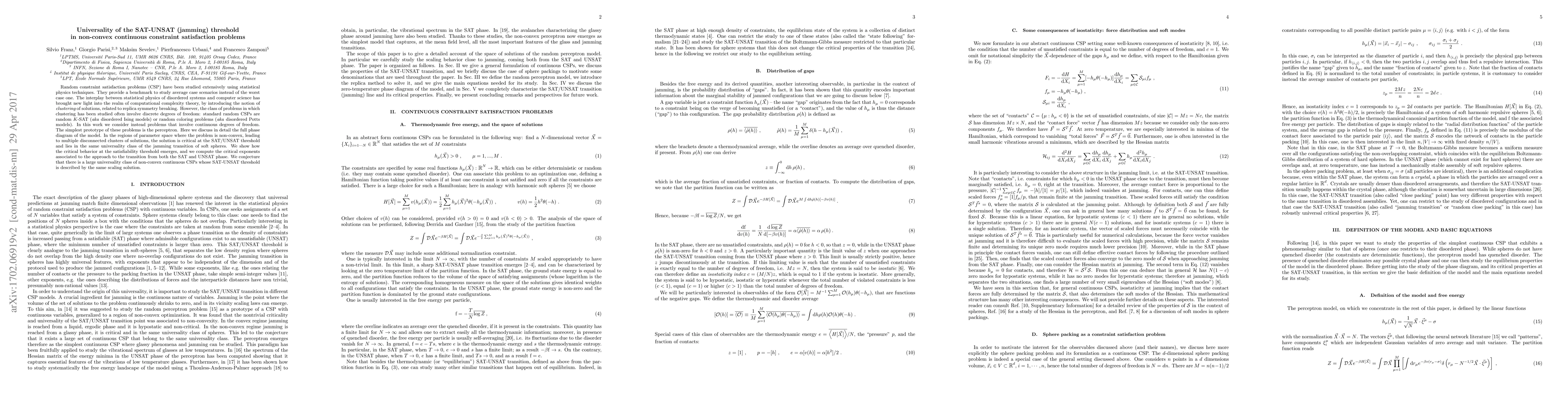Random constraint satisfaction problems (CSP) have been studied extensively using statistical physics techniques. They provide a benchmark to study average case scenarios instead of the worst case one. The interplay between statistical physics of disordered systems and computer science has brought new light into the realm of computational complexity theory, by introducing the notion of clustering of solutions, related to replica symmetry breaking. However, the class of problems in which clustering has been studied often involve discrete degrees of freedom: standard random CSPs are random K-SAT (aka disordered Ising models) or random coloring problems (aka disordered Potts models). In this work we consider instead problems that involve continuous degrees of freedom. The simplest prototype of these problems is the perceptron. Here we discuss in detail the full phase diagram of the model. In the regions of parameter space where the problem is non-convex, leading to multiple disconnected clusters of solutions, the solution is critical at the SAT/UNSAT threshold and lies in the same universality class of the jamming transition of soft spheres. We show how the critical behavior at the satisfiability threshold emerges, and we compute the critical exponents associated to the approach to the transition from both the SAT and UNSAT phase. We conjecture that there is a large universality class of non-convex continuous CSPs whose SAT-UNSAT threshold is described by the same scaling solution.