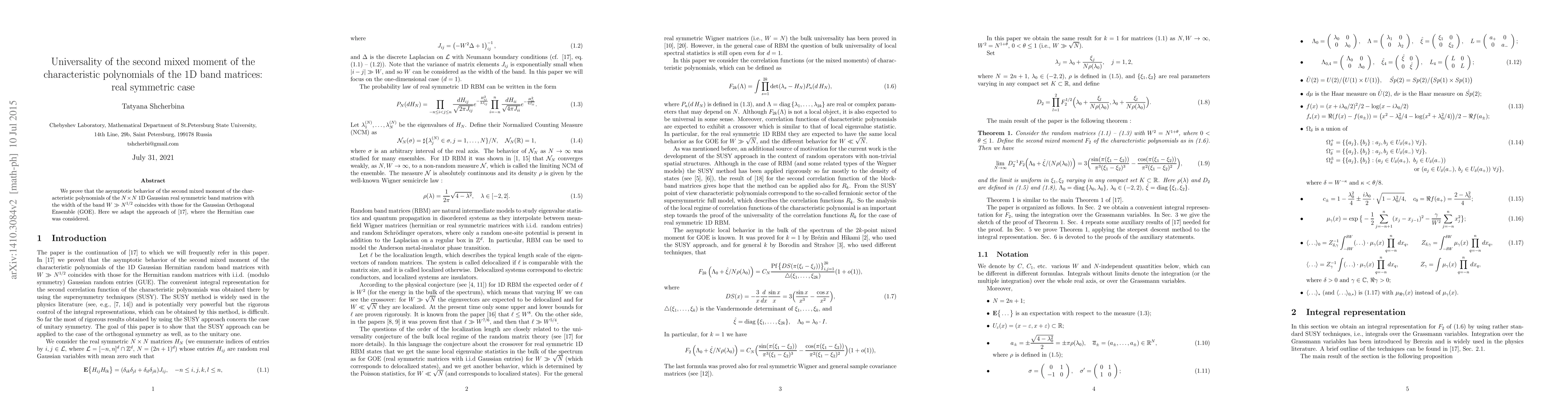 This paper demonstrates that the asymptotic second mixed moment of the characteristic polynomials of 1D Gaussian real symmetric band matrices aligns with that of the Gaussian Orthogonal Ensemble (GOE), employing methods developed for Hermitian random band matrices.